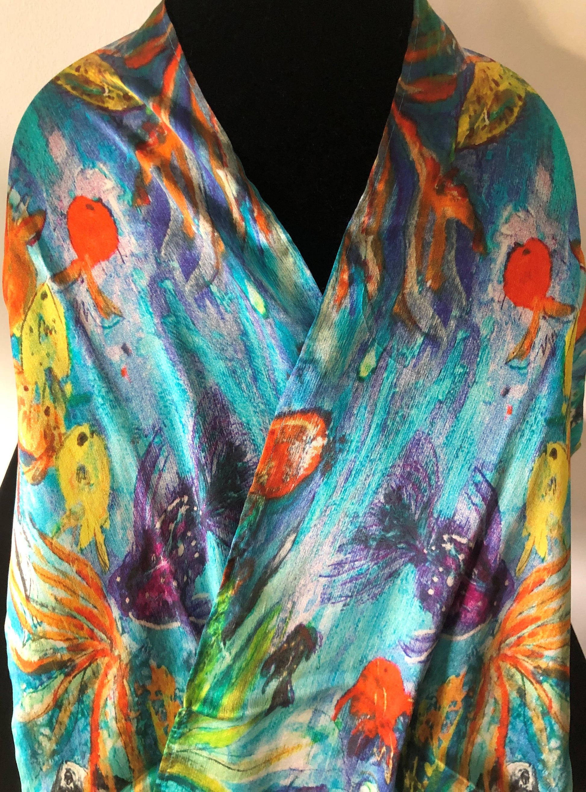 100% sateen silk, double stitched and hemmed for long life, limited edition designs from original art created by Neena Jhaveri. Bright and vibrant colors. Each scarf designed for multiple occasions - from informal gatherings to formal events. Each scarf affords the wearer to make a statement.