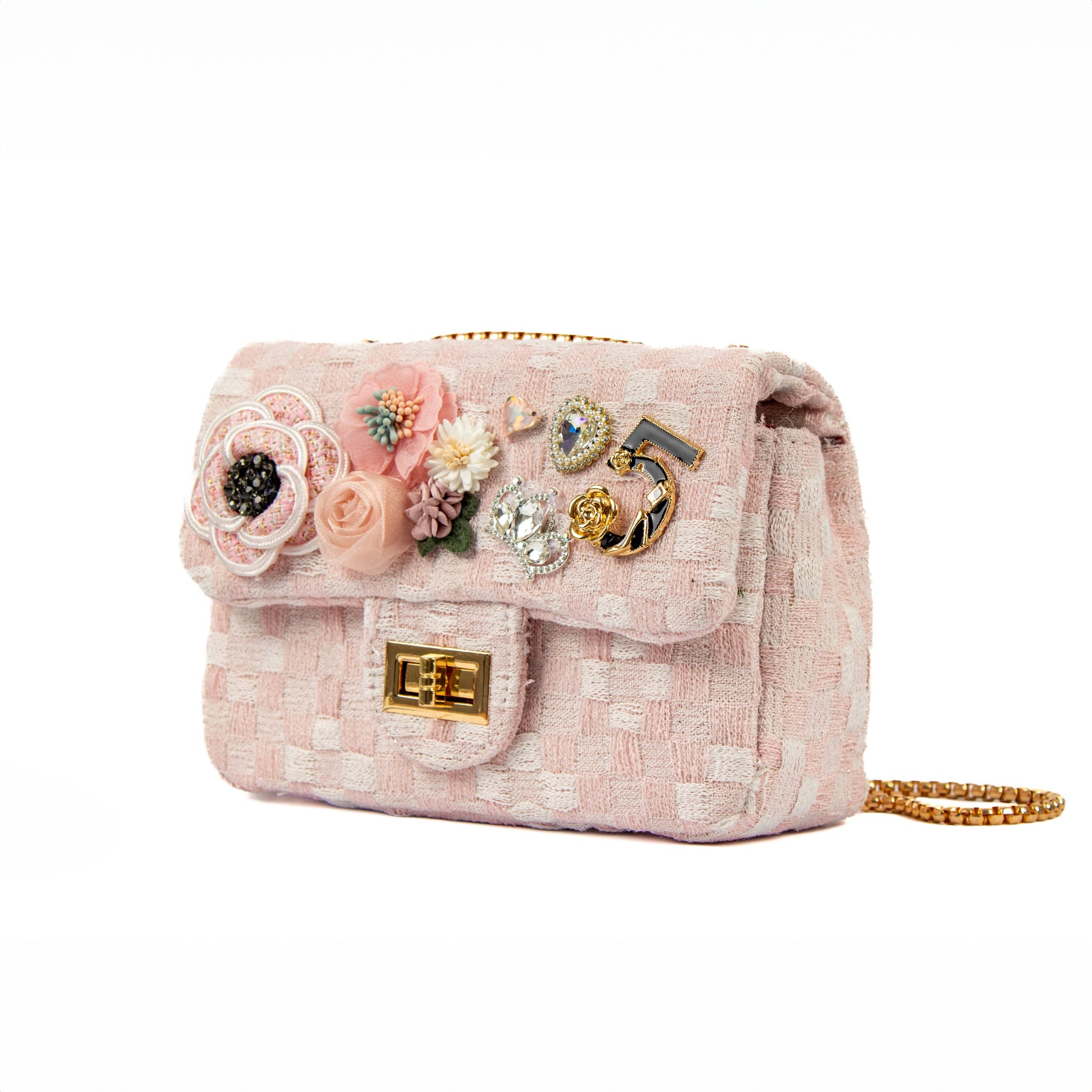 Crafted with meticulous attention to detail, this handbag features a lustrous array of crystals that delicately embellish the tweed fabric, creating a mesmerizing play of light and texture. The crystals are strategically placed to enhance the overall aesthetic, adding a touch of glamour to your ensemble.