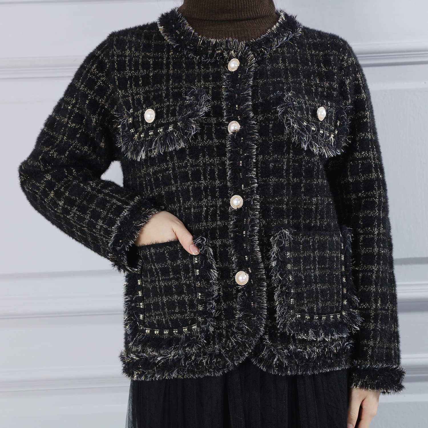 PEACH ACCESSORIES - Fringed Hem and Cuffs Cardigan with Pearly Buttons SD187: Black