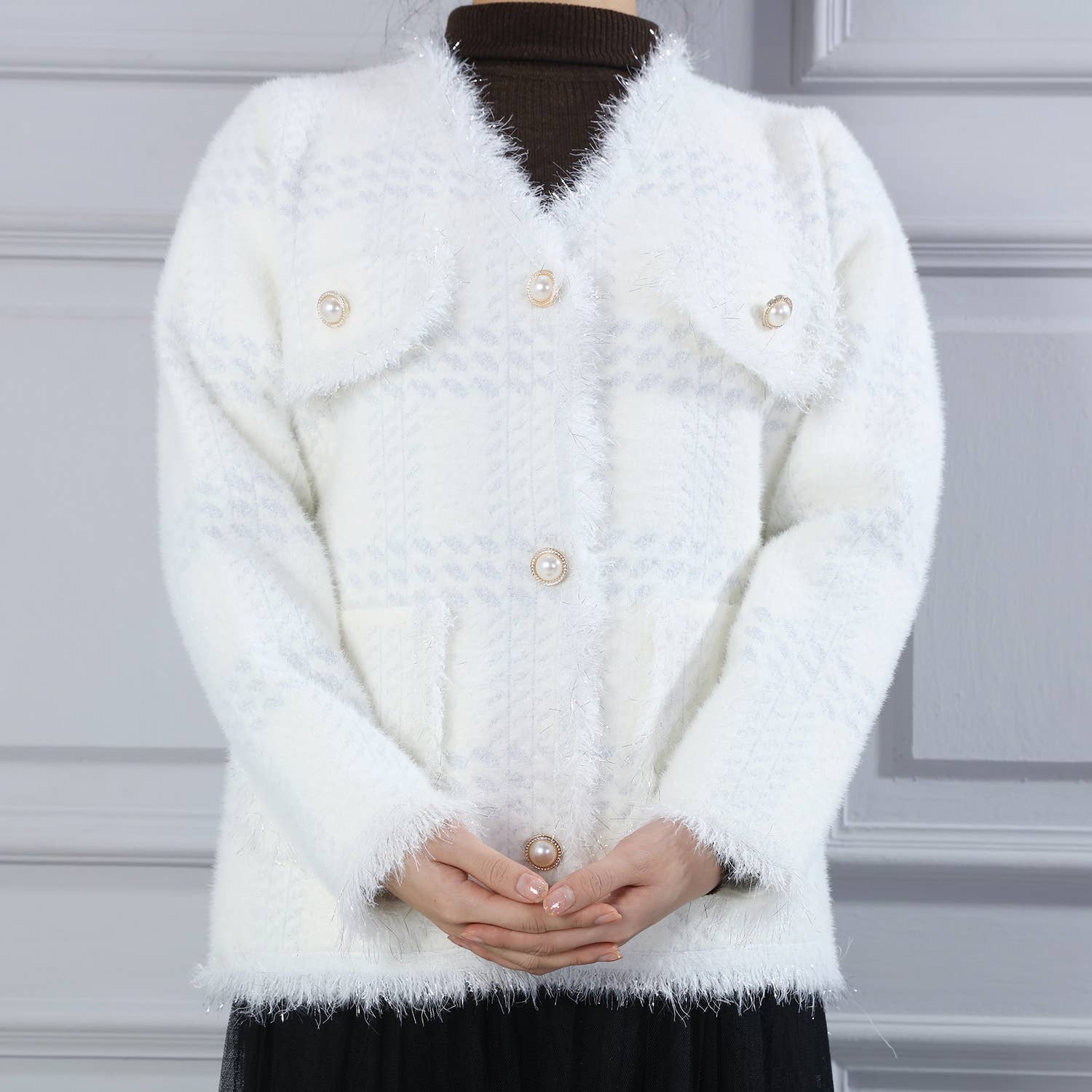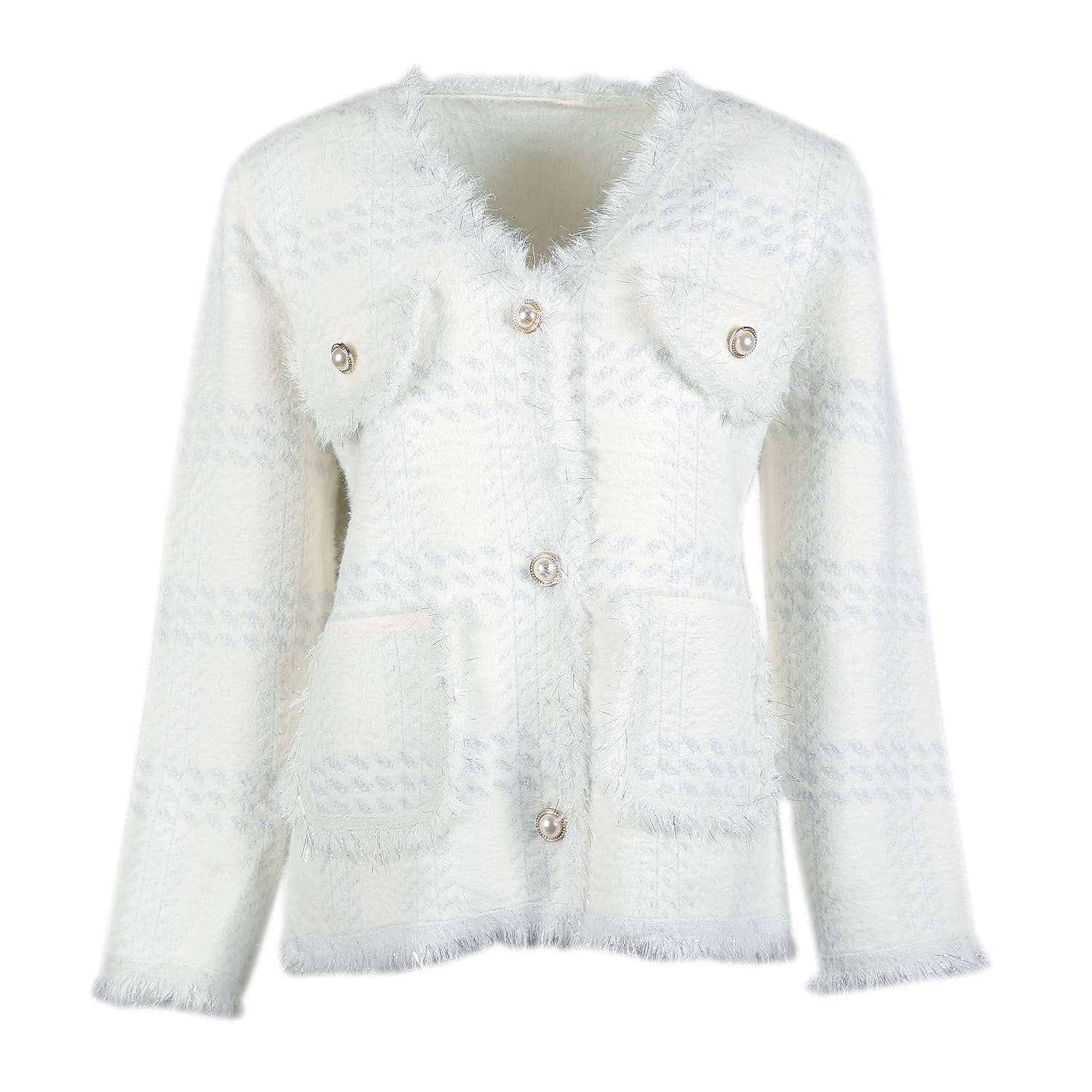 Wrap yourself in elegance with our exquisite Soft Cardigan adorned with shimmering silver accents. This versatile piece seamlessly transitions from day to night, making it a wardrobe essential.