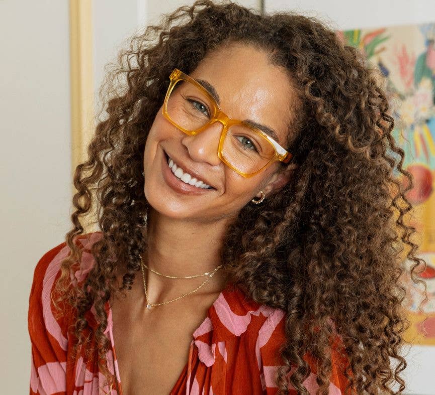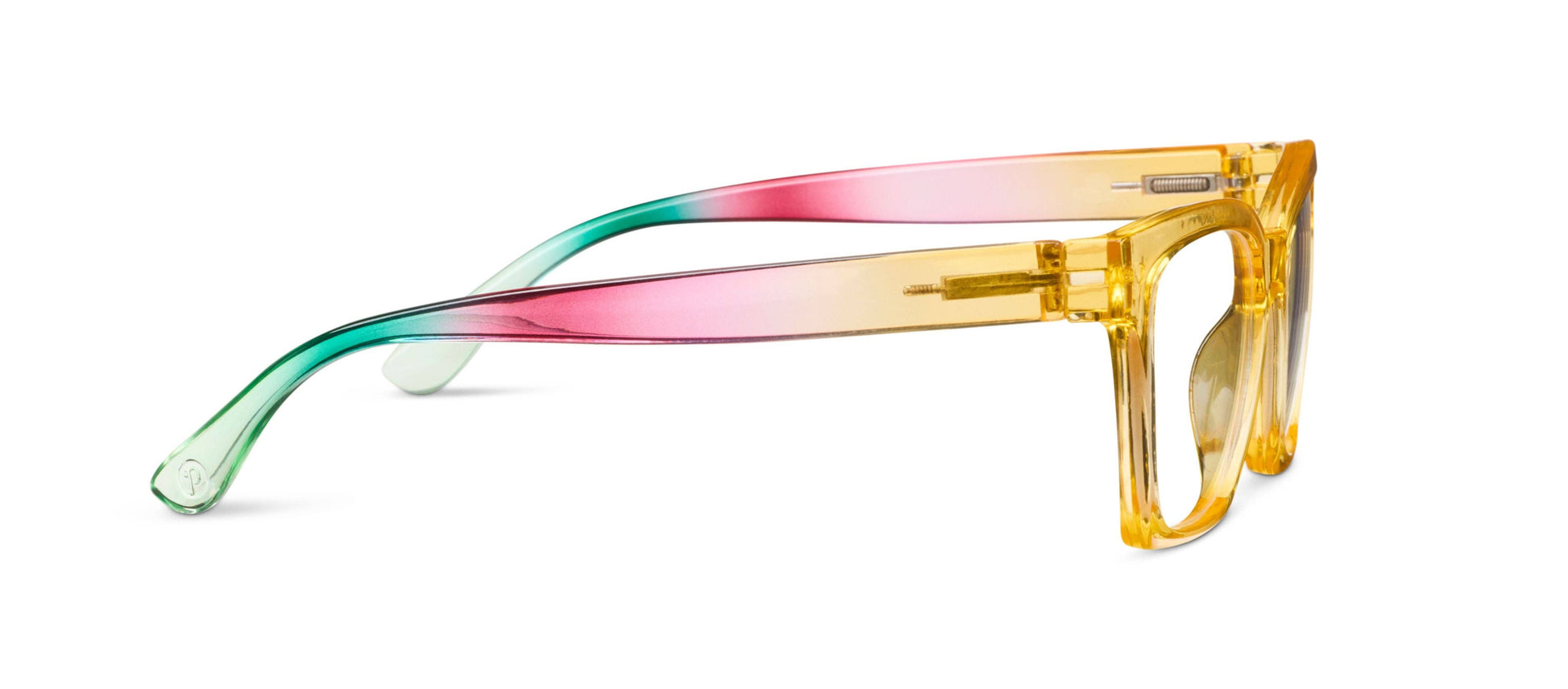 Why blend in when you could stand out? Maisie is a one-of-a-kind pair that makes a bold statement. While the classic square shape may be traditional, everything else about these frames is anything but. Choose the bright, translucent yellow fronts with colorful ombre temples, or opt for the blue fronts with a bold ikat pattern on the side.