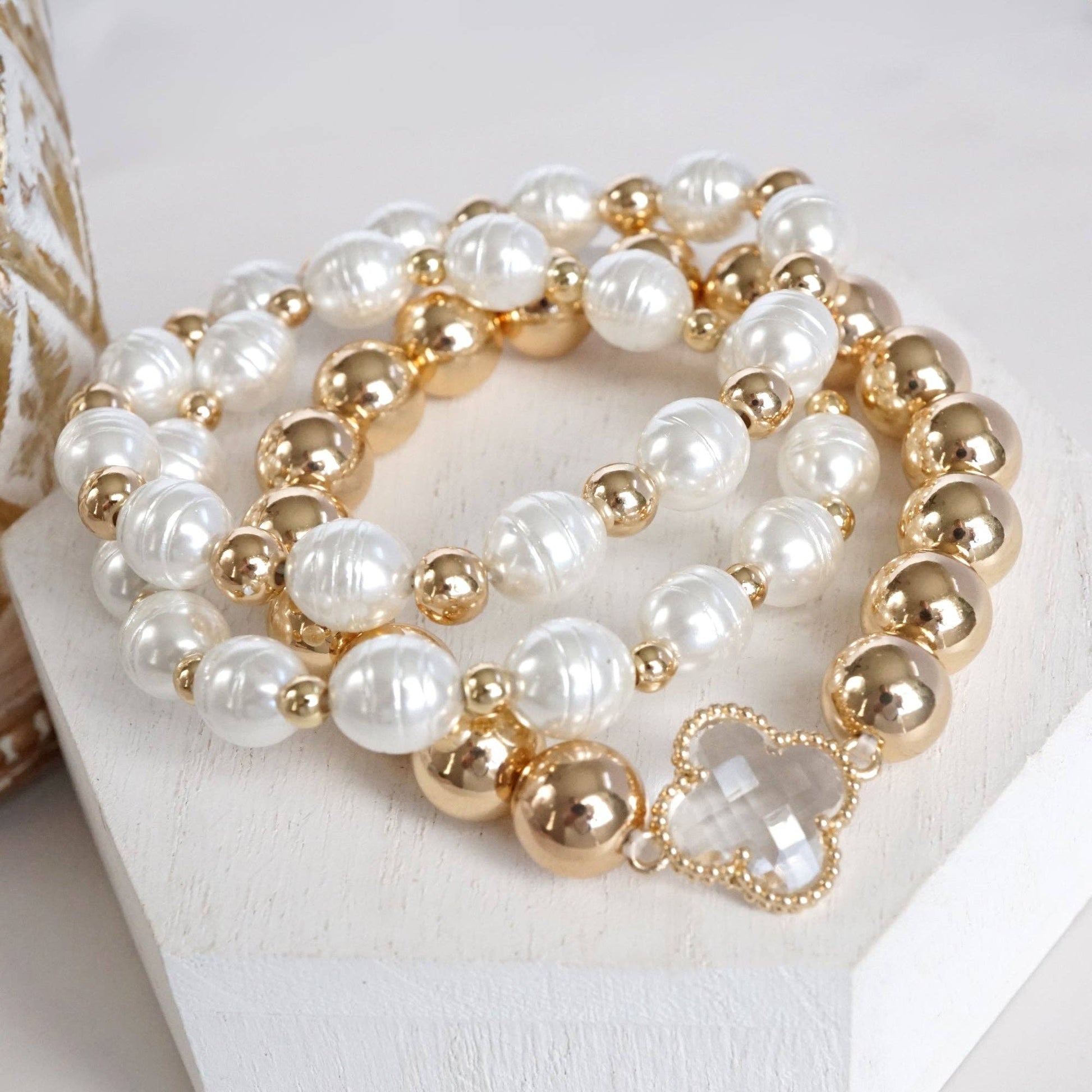 A striking blend of bold textures and timeless charm, this set of three stretch bracelets features lustrous pearlized beads, radiant gold-tone spheres, and a faceted glass clover charm framed in gold. Perfect for making a statement, whether styled solo or stacked for a luxe layered look.