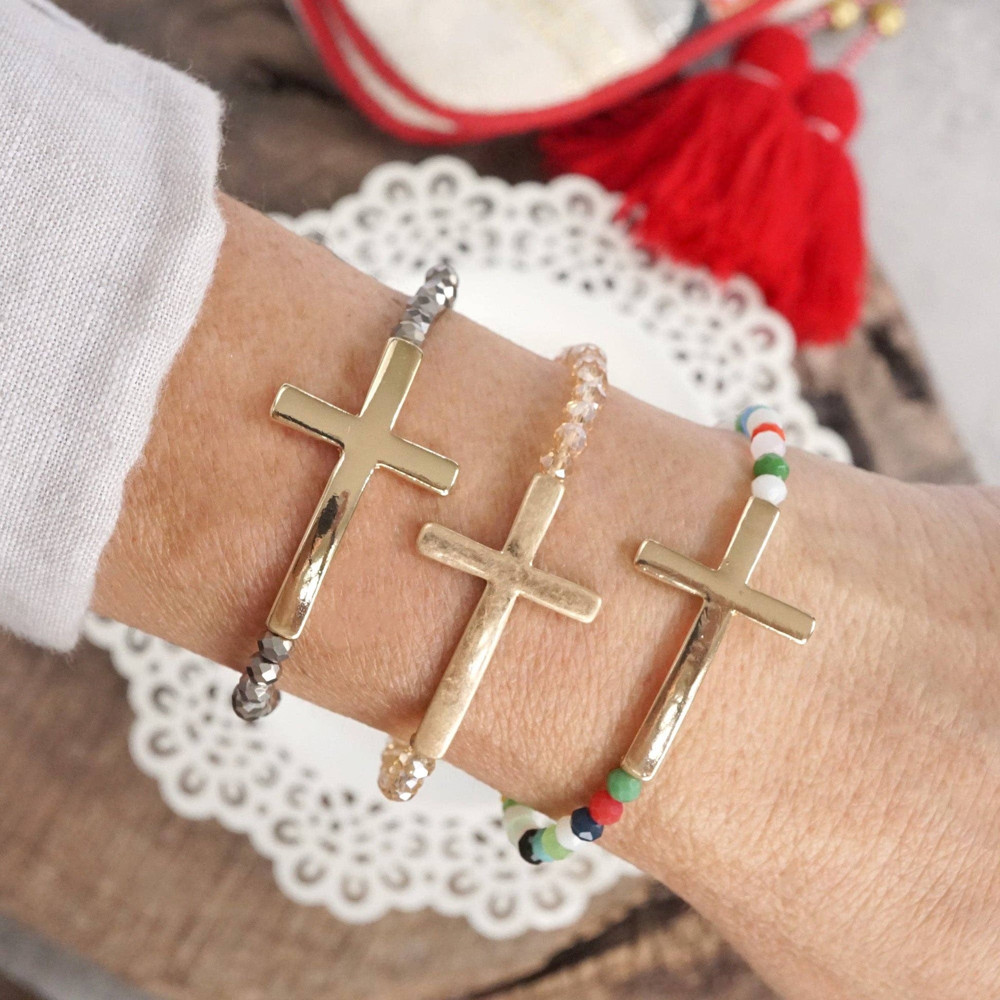 PennyLine inc - Minimal Sideways Cross Bracelet with Glass Beads Gold tone: Champaign Glass Beads
