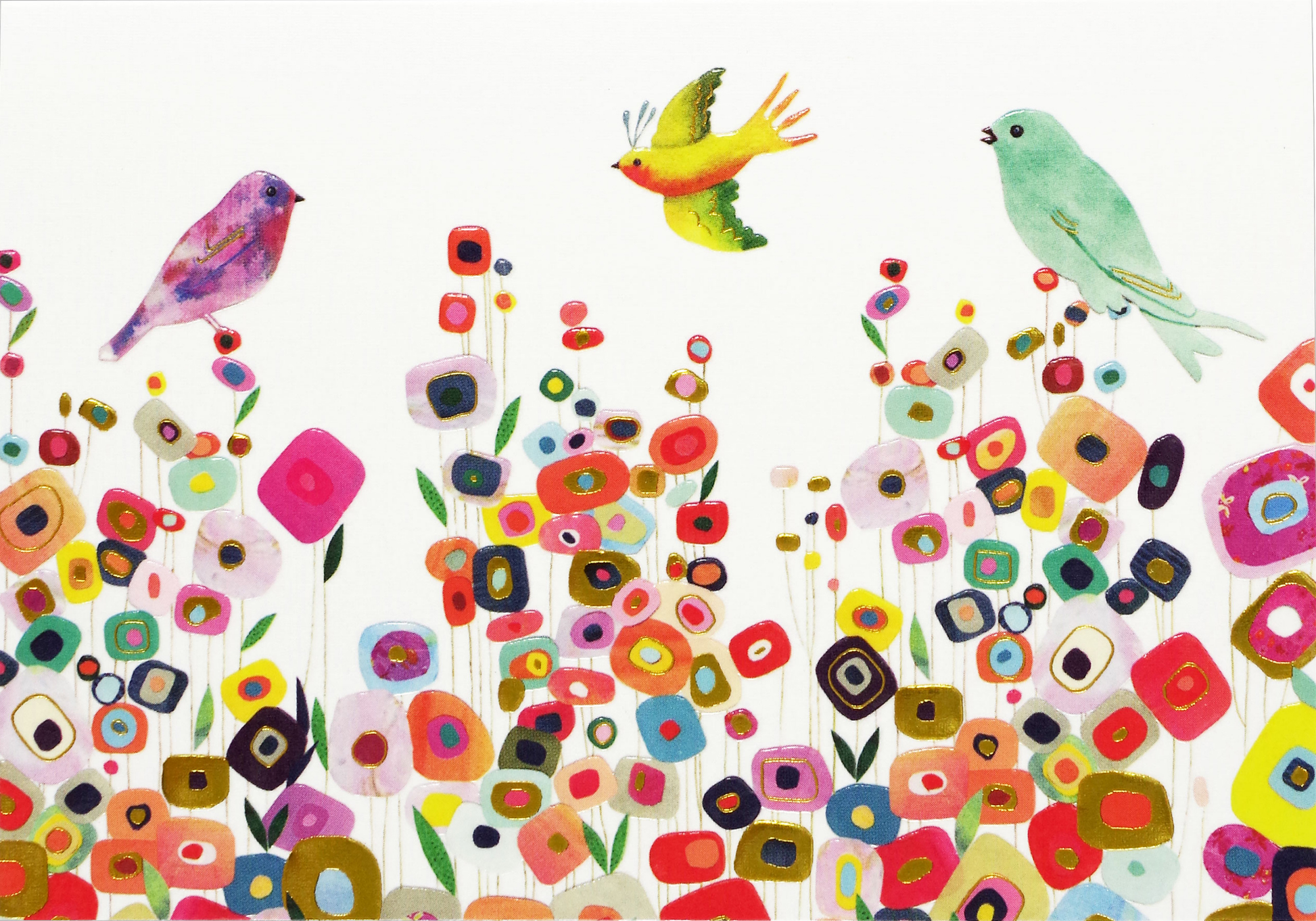 Brighten their day with a personal note and an elegant card! Beautiful note cards are a pleasure to send and to receive! Premium boxed stationery set comes with 14 note cards and 15 envelopes. Note card interiors are blank for your personal messages. Smooth-finish uncoated card stock takes pen beautifully. Card exteriors feature a crisp linen-like finish. Design depicts three multi-colored birds and a colorful array of abstract-art flowers. Birds and flowers ''pop'' with embossed gloss highlights and touches of gold foil. Matching stationery envelopes complete the set. Note card set is suitable for gift-giving. Cards are suitable for a variety of occasions. Cards measure 5'' wide x 3-1/2'' high. Cards come in a matching board box with a clear acetate lid.