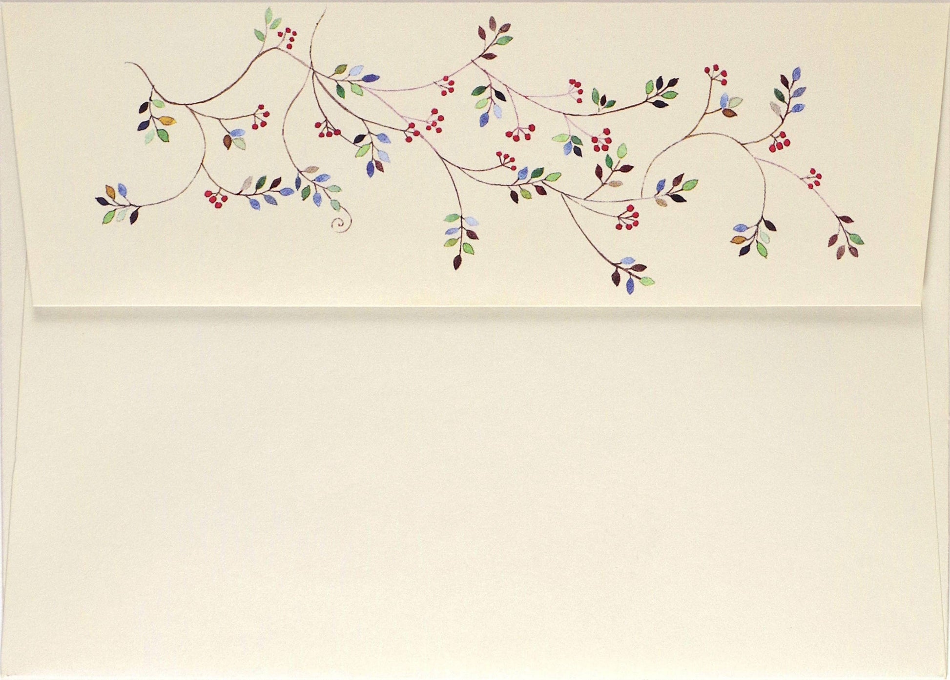 Whimsical ornaments hang from branches of holly on this lovely little greeting card. Premium boxed card set includes 20 cards and 21 coordinating envelopes. Cards are small -- they measure 5'' wide x 3-1/2'' high. Quality card stock takes pen beautifully. Greeting: Season's Greetings Gold foil detailing catches the eye. Matching stationery envelopes reproduce a detail of the design on each flap. Card set comes in a board box with a clear acetate lid.