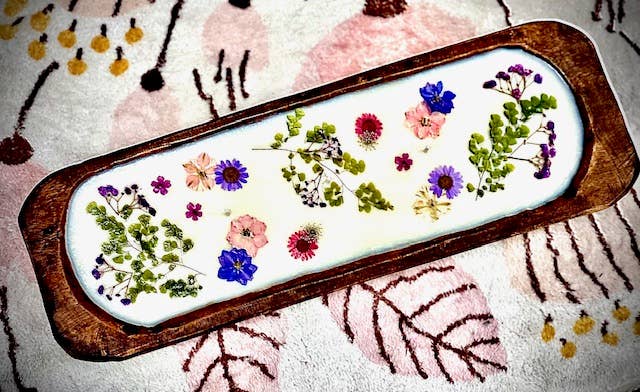 100% American farm grown soy wax infused with our signature essential oil-based lavender fragrance and hand-poured into hand-carved wood bread bowl with 3 cotton lead free wicks and accented with reel pressed flowers. No artifical dyes or toxic chemicals used.