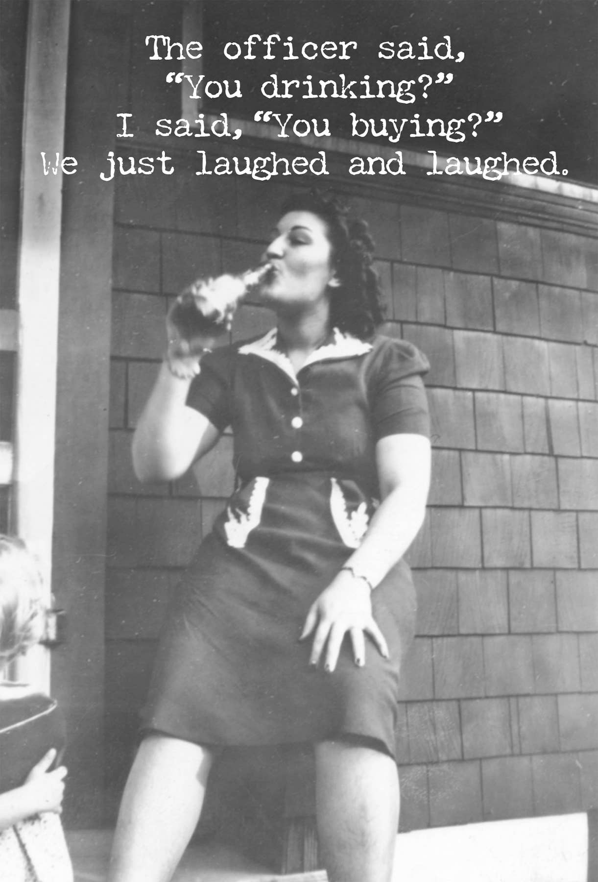 Made in the USA. Outside: The officer said," You drinking?" I said, "You Buying?" We just laughed and laughed.