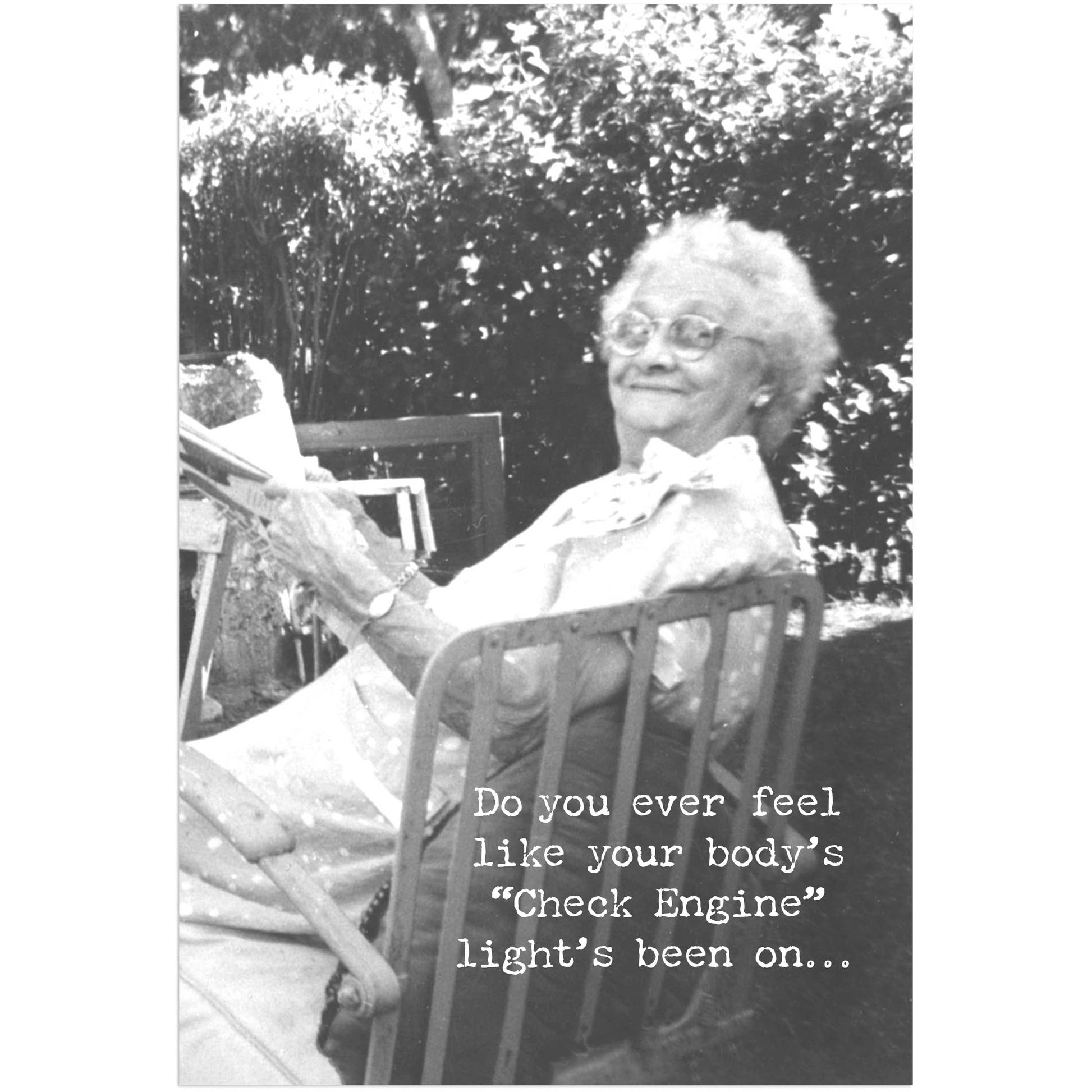 A humorous greeting card from our Trash Talk By Annie Collection displaying a vintage photograph with complementing sentiment. Card features "Do You Ever Feel Like Your Body's 'Check Engine' Light's Been On..." sentiment on the outside and "But You're Still Driving It Like 'Nah, It'll Be Fine?'" sentiment on the inside with space to add a personalized message. Our Check Engine greeting card is a hilarious gifting option for everyday moments. Proudly made in the USA.