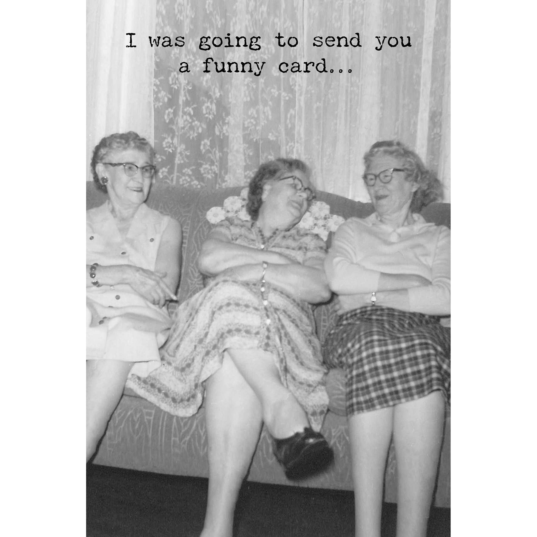 A humorous greeting card from our Trash Talk by Annie Collection features a vintage photograph with "I Was Going To Send You A Funny Card…" sentiment on the outside, and "But At Your Age I'm Genuinely Concerned That You Might Piss Yourself." sentiment on the inside. Our Funny Card greeting card is made in the USA.