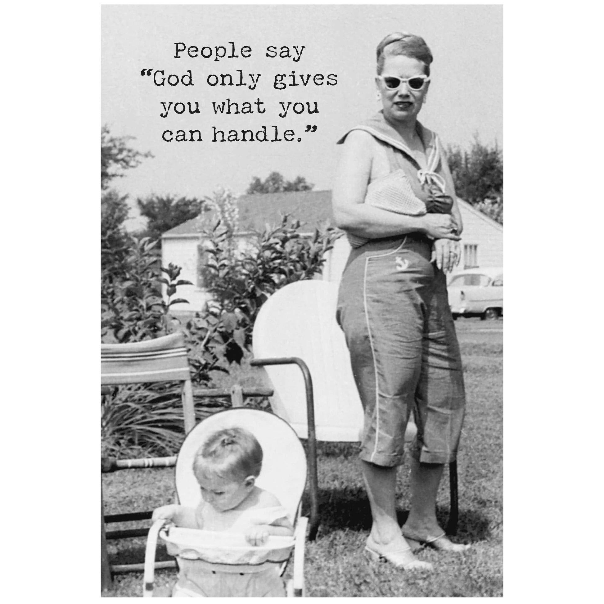 A greeting card from our Trash Talk By Annie Collection displaying a fun vintage black and white photograph complemented with a humorous inspirational sentiment. Greeting card features "People Say 'God Only Gives You What You Can Handle.'" sentiment on the outside and "Apparently, God Thinks You're A Bad Ass! So Do I. Hang In There." sentiment on the inside with space to add a personalized message. Our Hang In There greeting card is a hilarious gifting option for everyday moments. Proudly made in the USA.