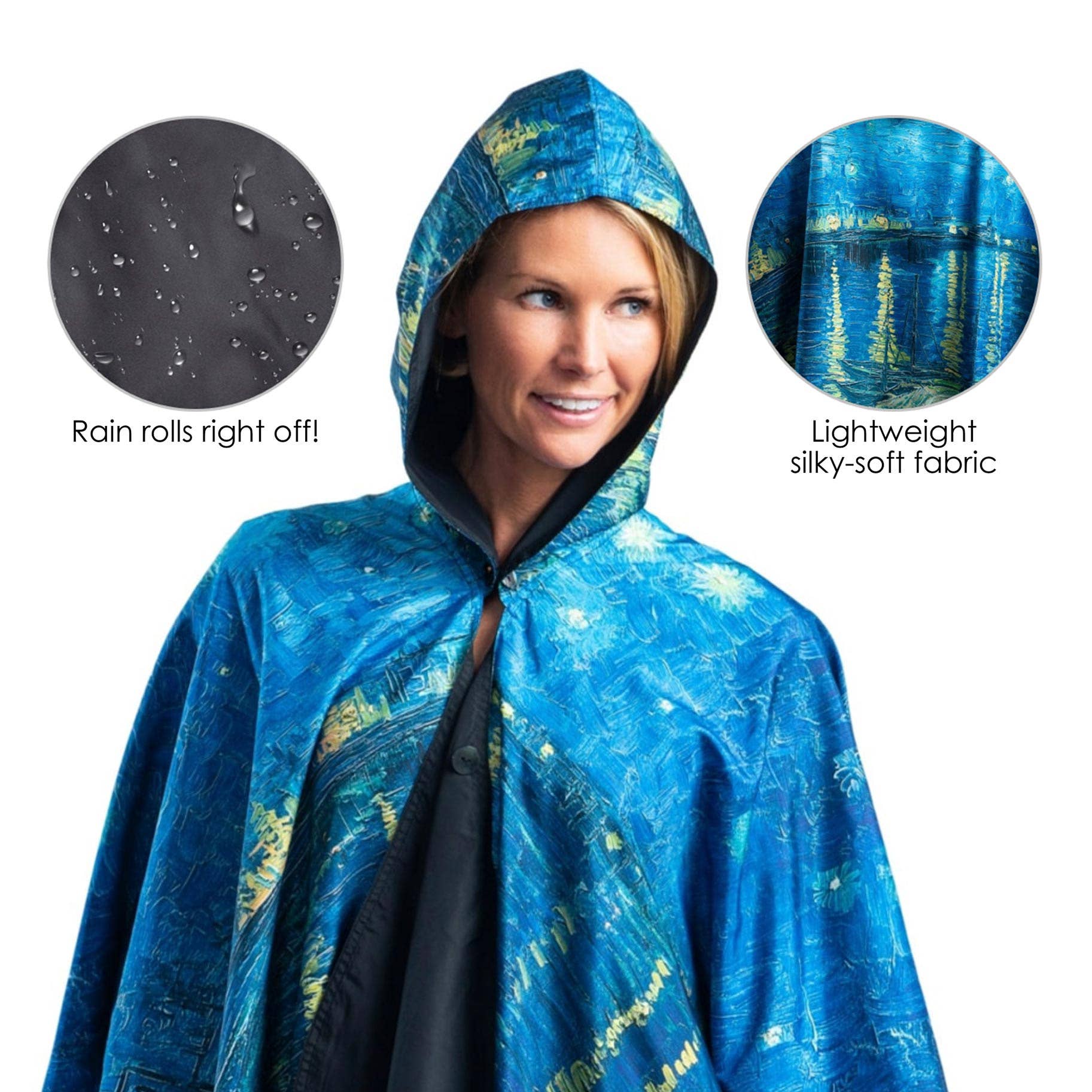 More than a lightweight women’s rain poncho, the packable, rainproof & windproof travel cape offers effortless comfort and timeless style. Enjoy the silky-soft, luxurious, and supple fabric as you wrap yourself in this fashionable travel cape that makes it clear you’re going places. Ideal for transitional weather, it may be worn as a cape alone, or wear it over a jacket or coat in cooler or rainy weather – the ultra-versatile RainCaper works drizzle or downpour, rain or shine.