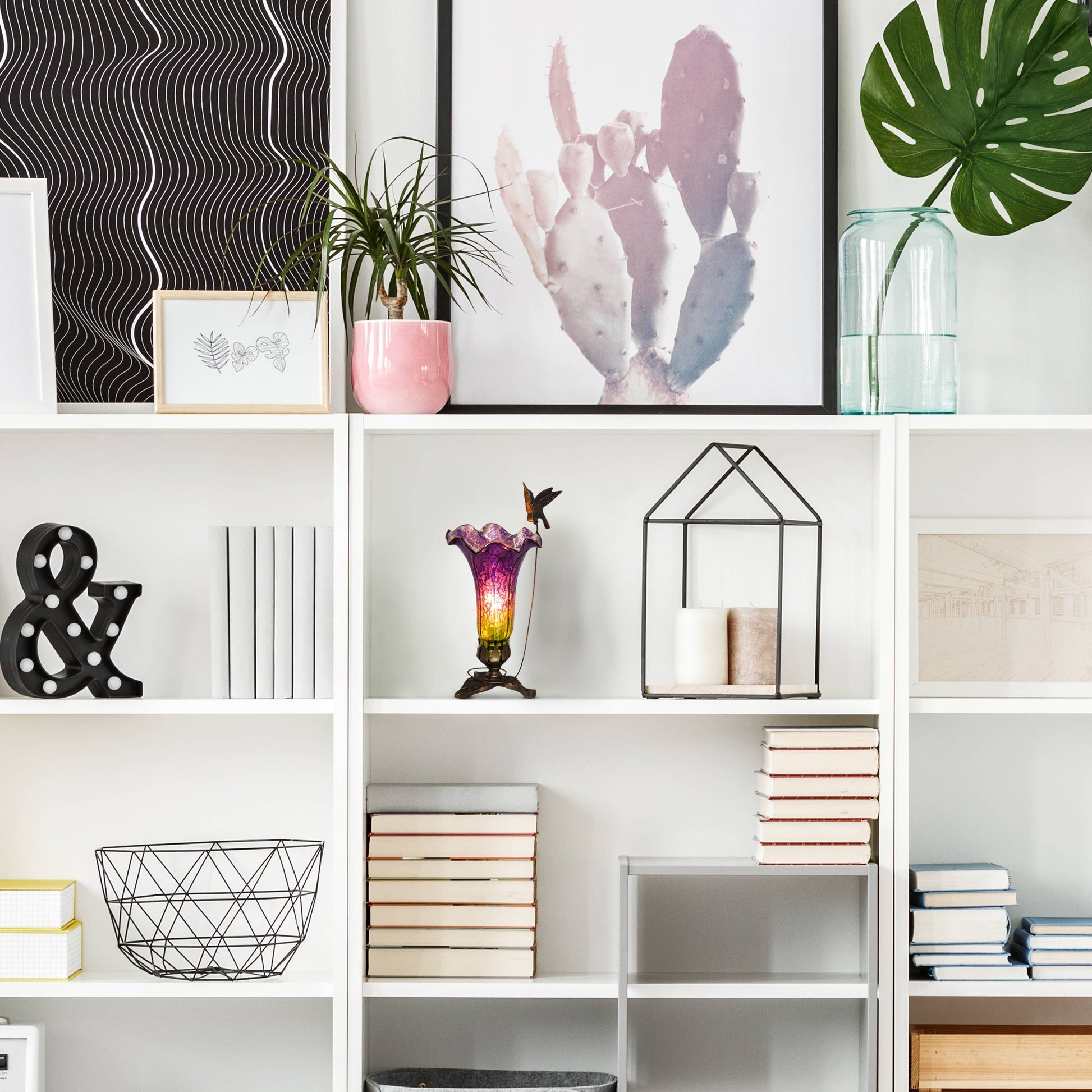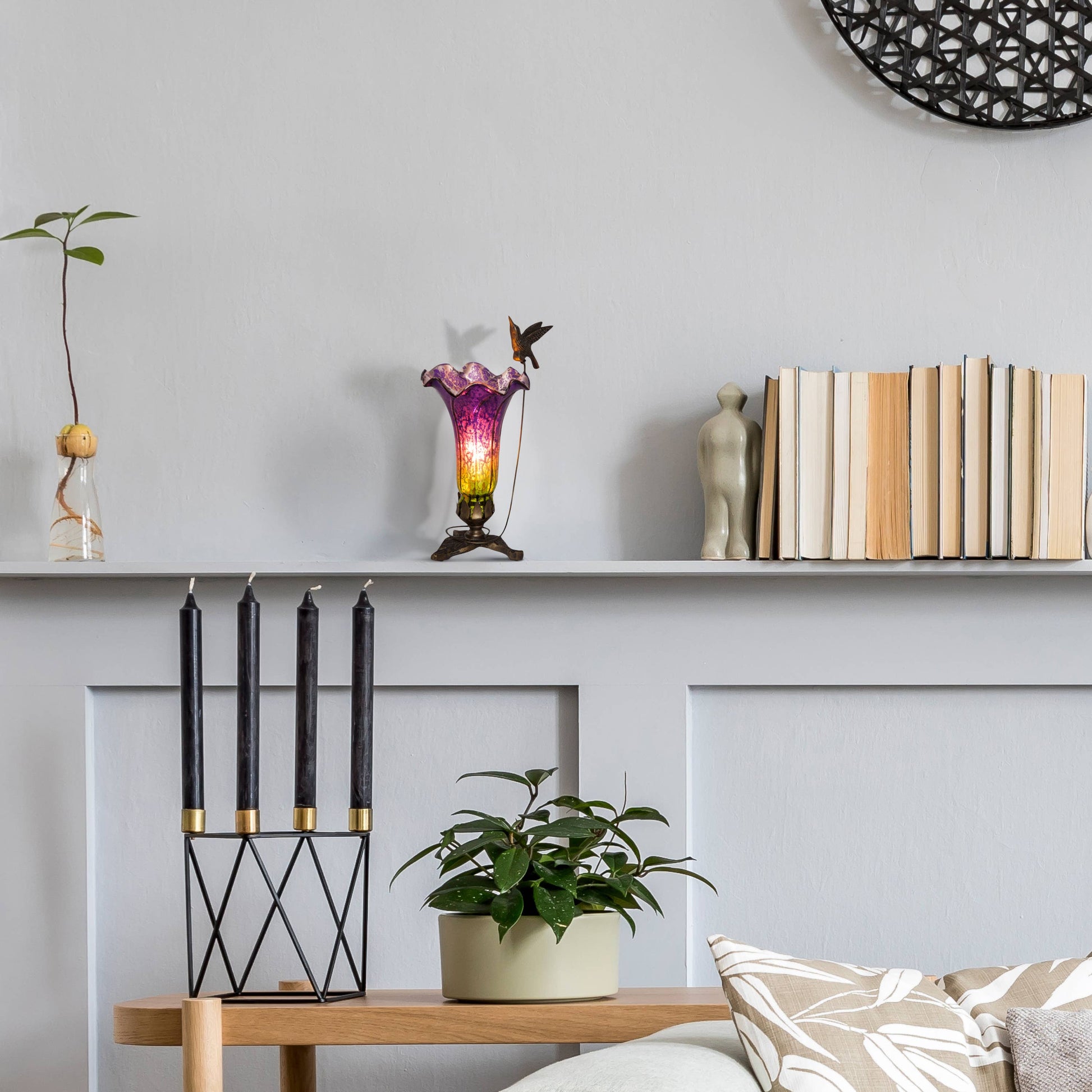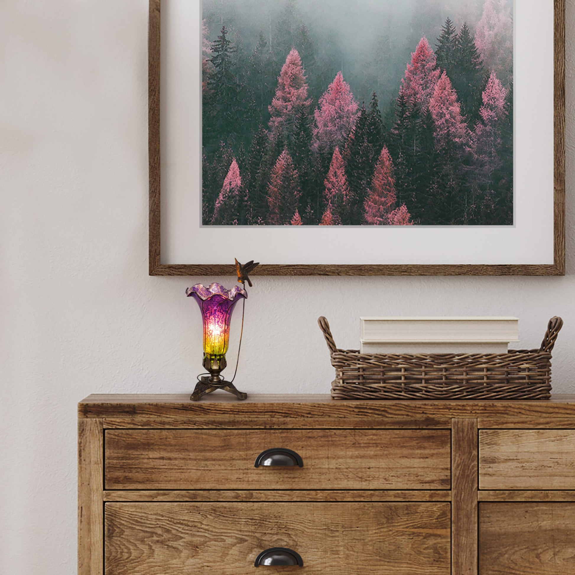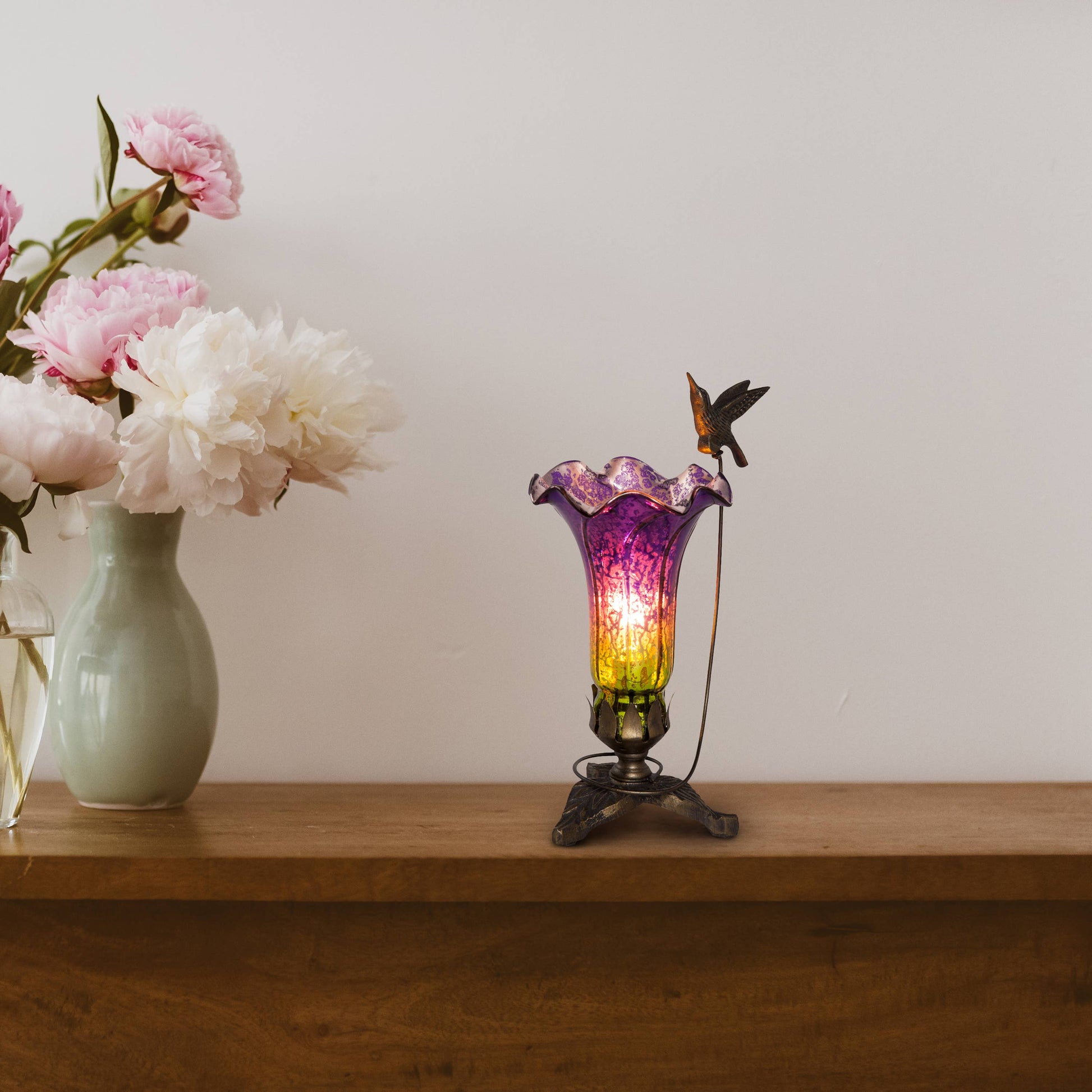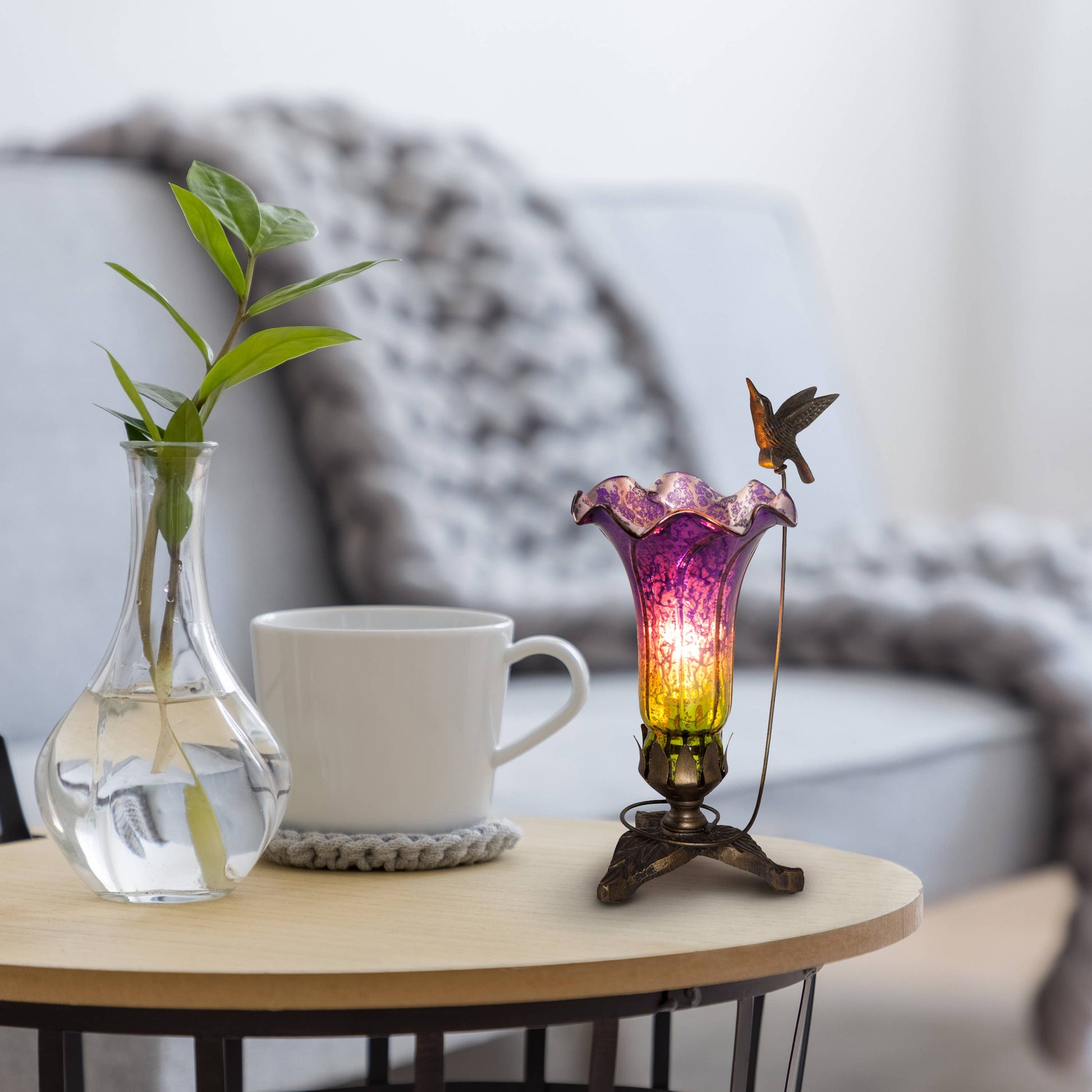 Perched perfection! This lily lamp is handcrafted with richly toned purple and green mercury glass. The base is made with 100% hand cast metal and adorned with a flying hummingbird above the lily shade . The exquisite craftsmanship makes this an ideal accent for any space and lily lamps also make great gift items!