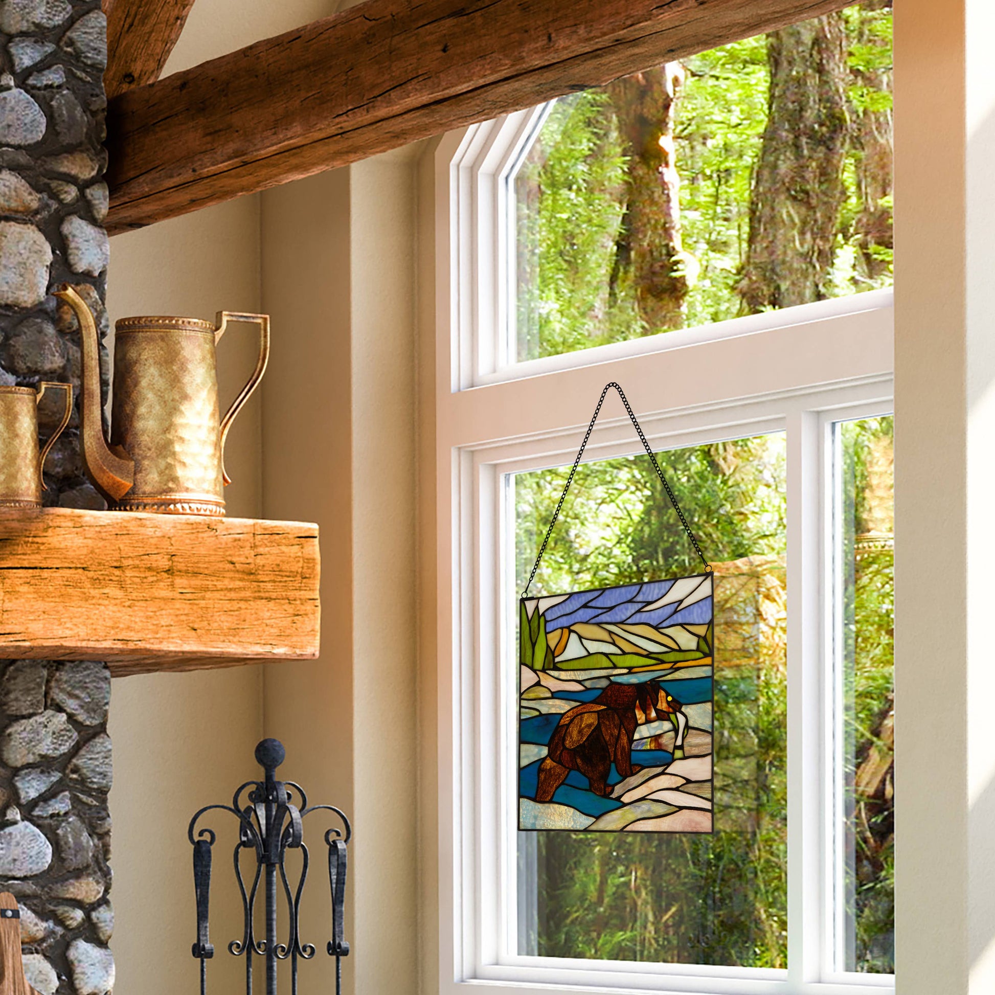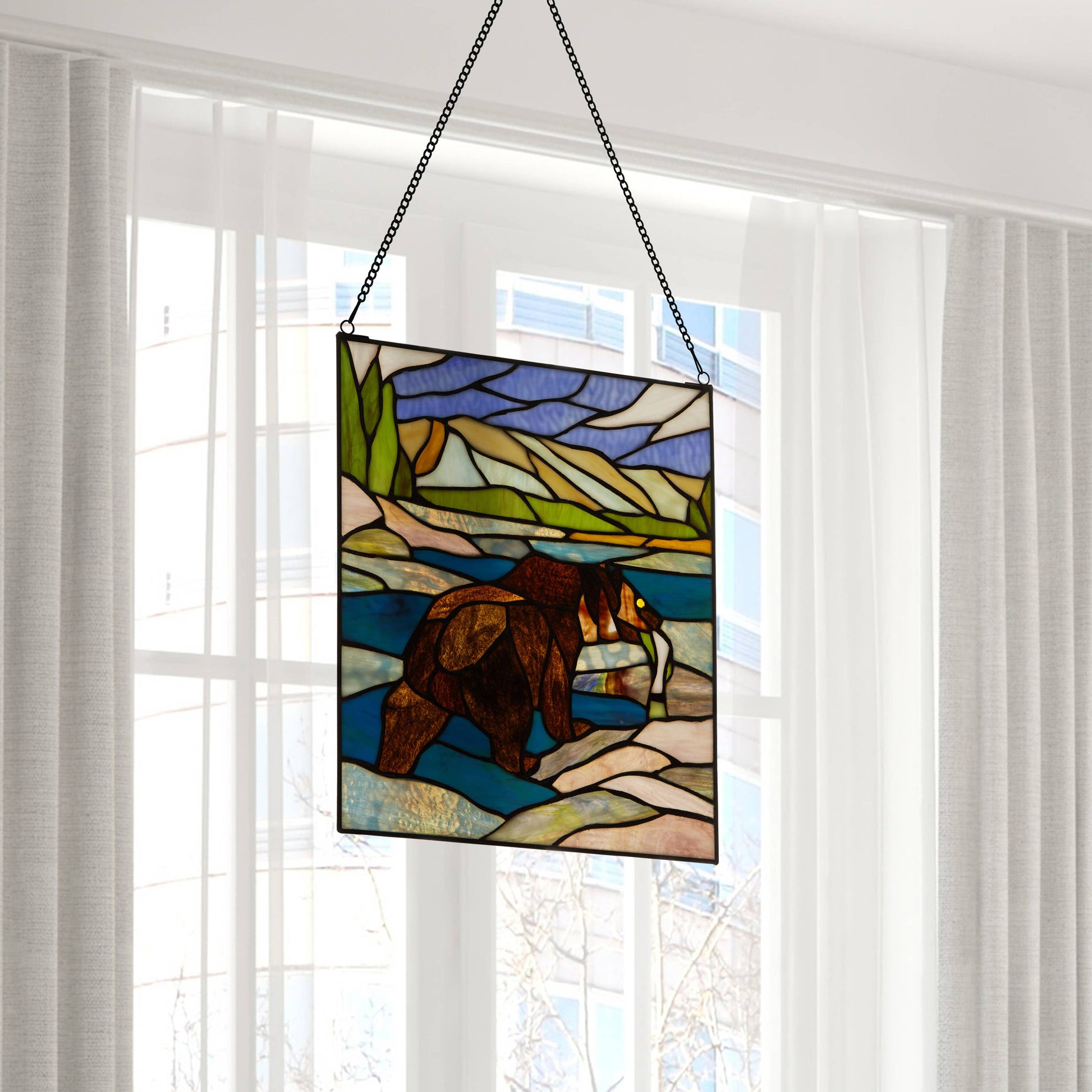 Hang this nature-inspired stained glass window panel in any sunny window to create an eye-catching focal point in the room. This stained glass suncatcher is handcrafted from 88 individual glass cuts and is constructed using traditional artisan soldering methods. It features a fishing bear design in brown, amber, blue and green hues that becomes more vibrant when light passes through the glass. Plus, the stained glass suncatcher comes with an attachable decorative hanging chain for easy display.