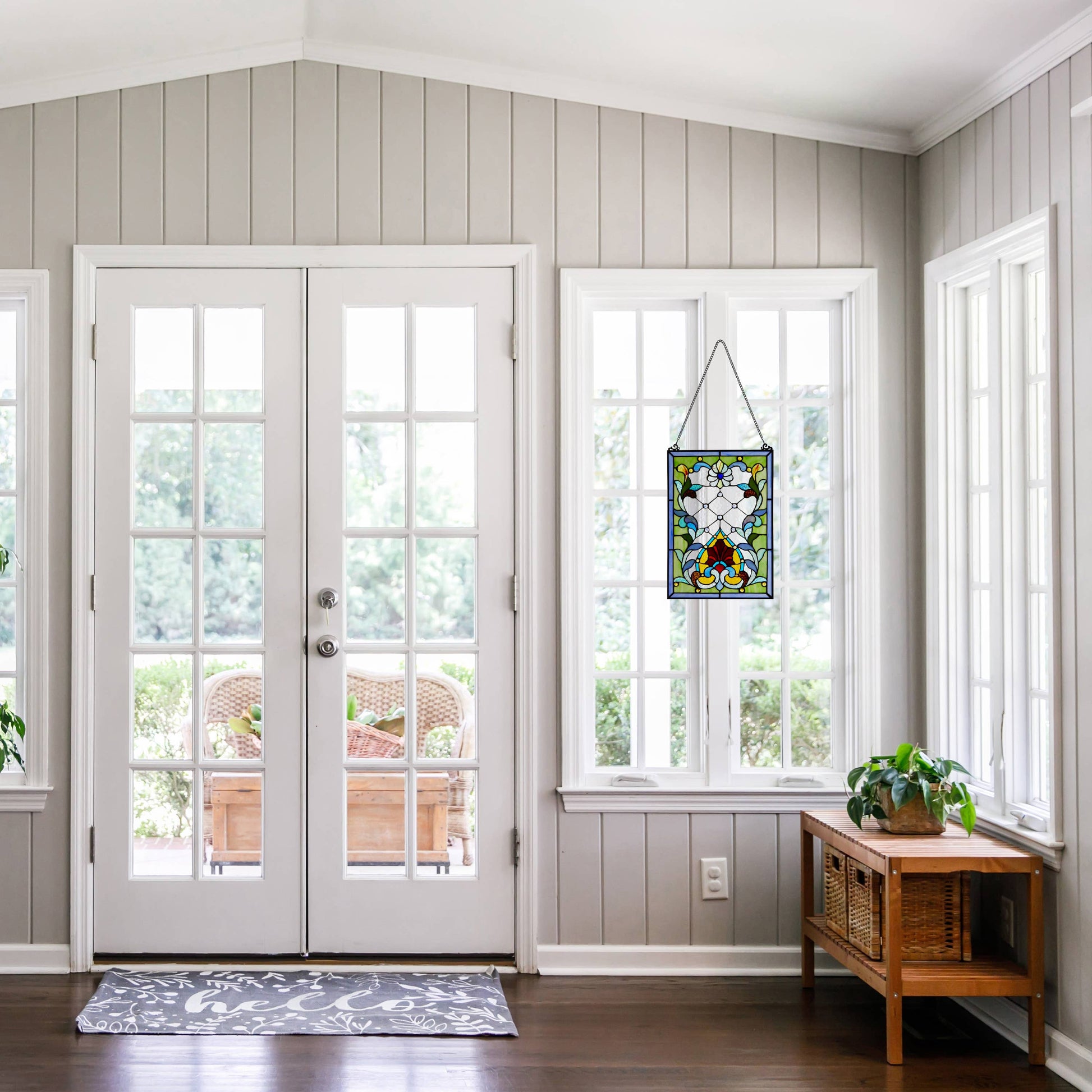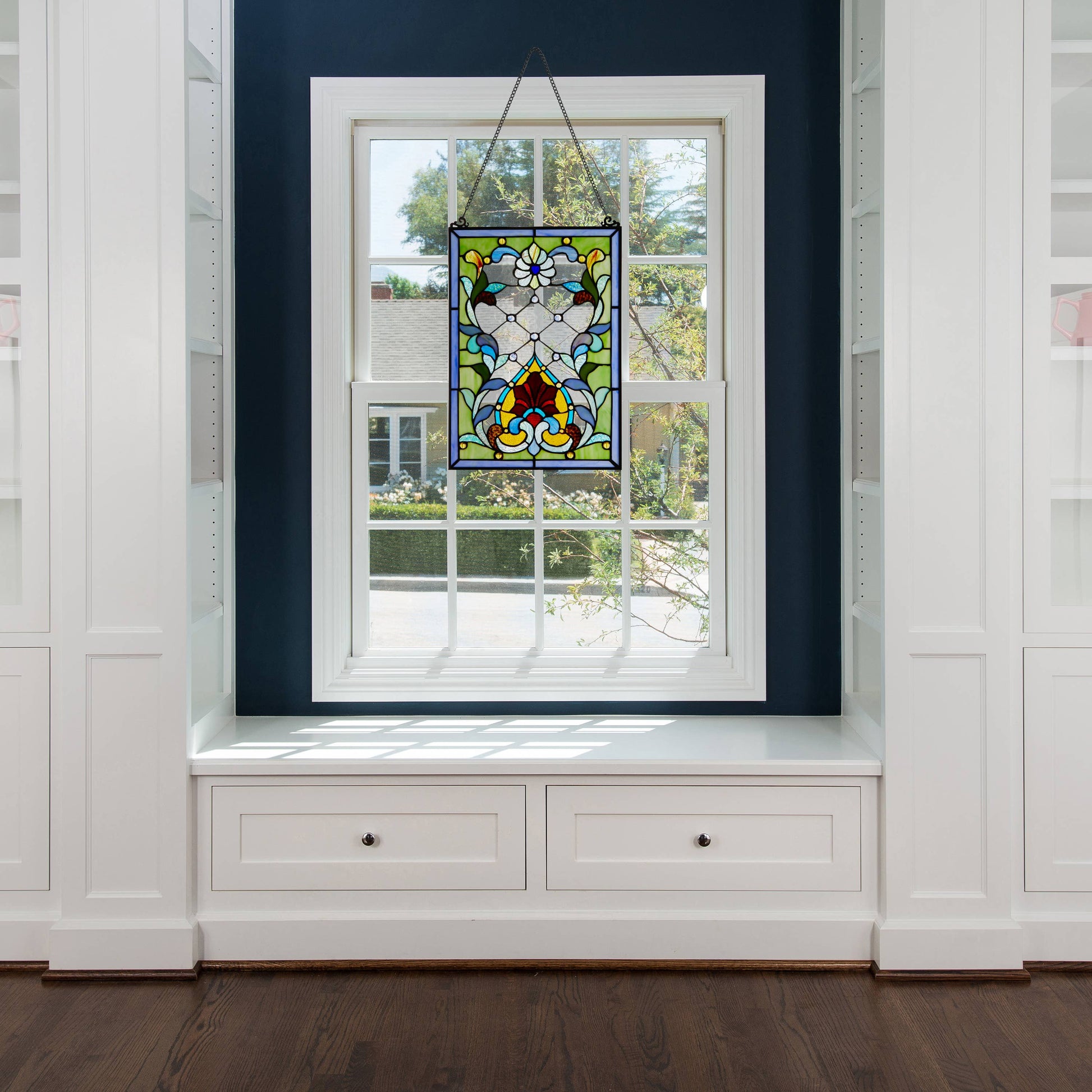 The 19"H Alice Flower and Vine Stained Glass Window Panel from River of Goods lets you bring a colorful, traditional-style accent piece to your home decor. This artisanal Tiffany-style stained glass panel has the look of a painting crafted in glass, & is composed of 157 individual glass cuts in blue, green, red and yellow hues & is also adorned with 23 cabochons. The included metal link chain allows for immediate hanging in your kitchen, living room, sunroom or wherever you desire — just be sure to place the stained glass suncatcher in a sunny window to see the colors brighten as it catches the light.