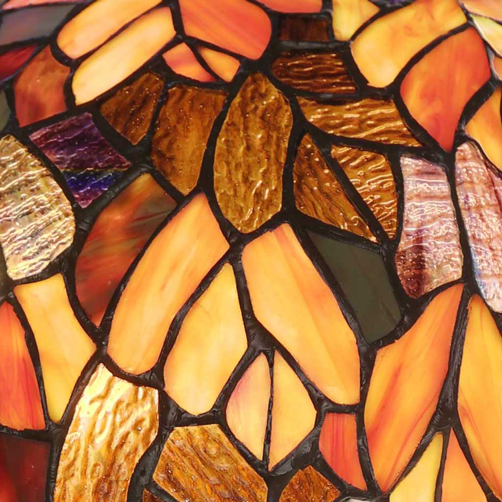 Marvelous. This lamp features more than 400 green, brown, and orange glass cuts that form vibrant leaves that tumble from the top of its tree trunk base. It adds an elegant touch of nature to your living space and brings the beauty indoors.