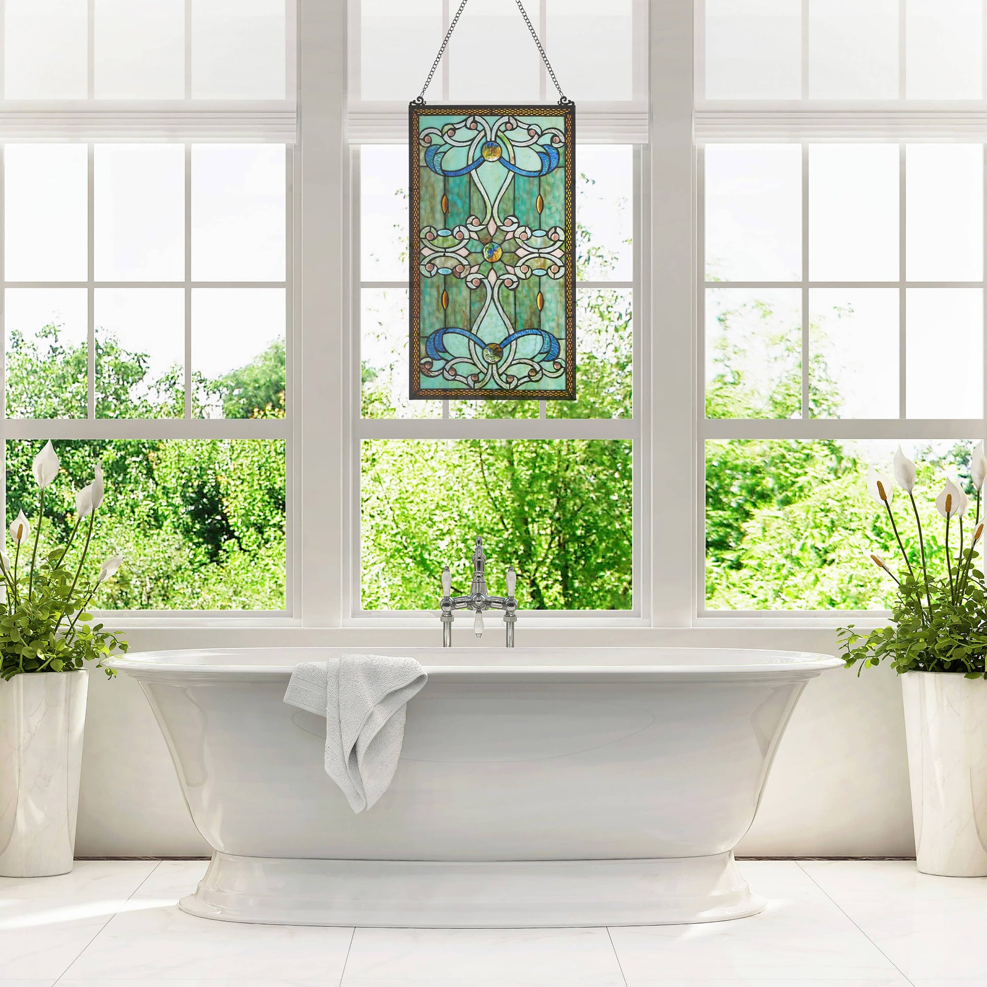 Lavishing swirls! Inspired by one of our best-selling designs, this 26"H window panel features the same delicate ribbons, glass rosettes and marquee cabochons. This piece is crafted with high end ripple glass. The stained glass suncatcher, made of 206 pieces of glass, 32 cabochons, and 3 hand-poured glass rosettes, is framed with a basket weave filigree. When placed in a window these panels come to light! They can be hung on a wall as well. Use it to create privacy without blocking the natural light.