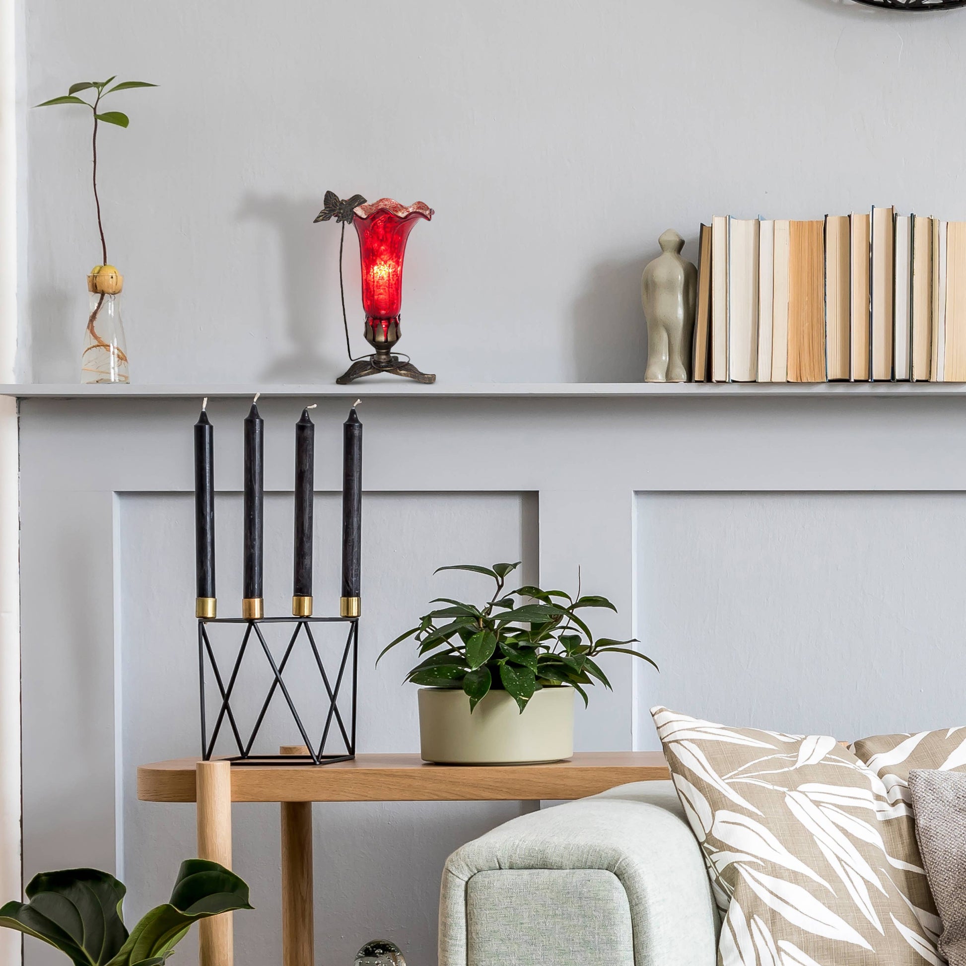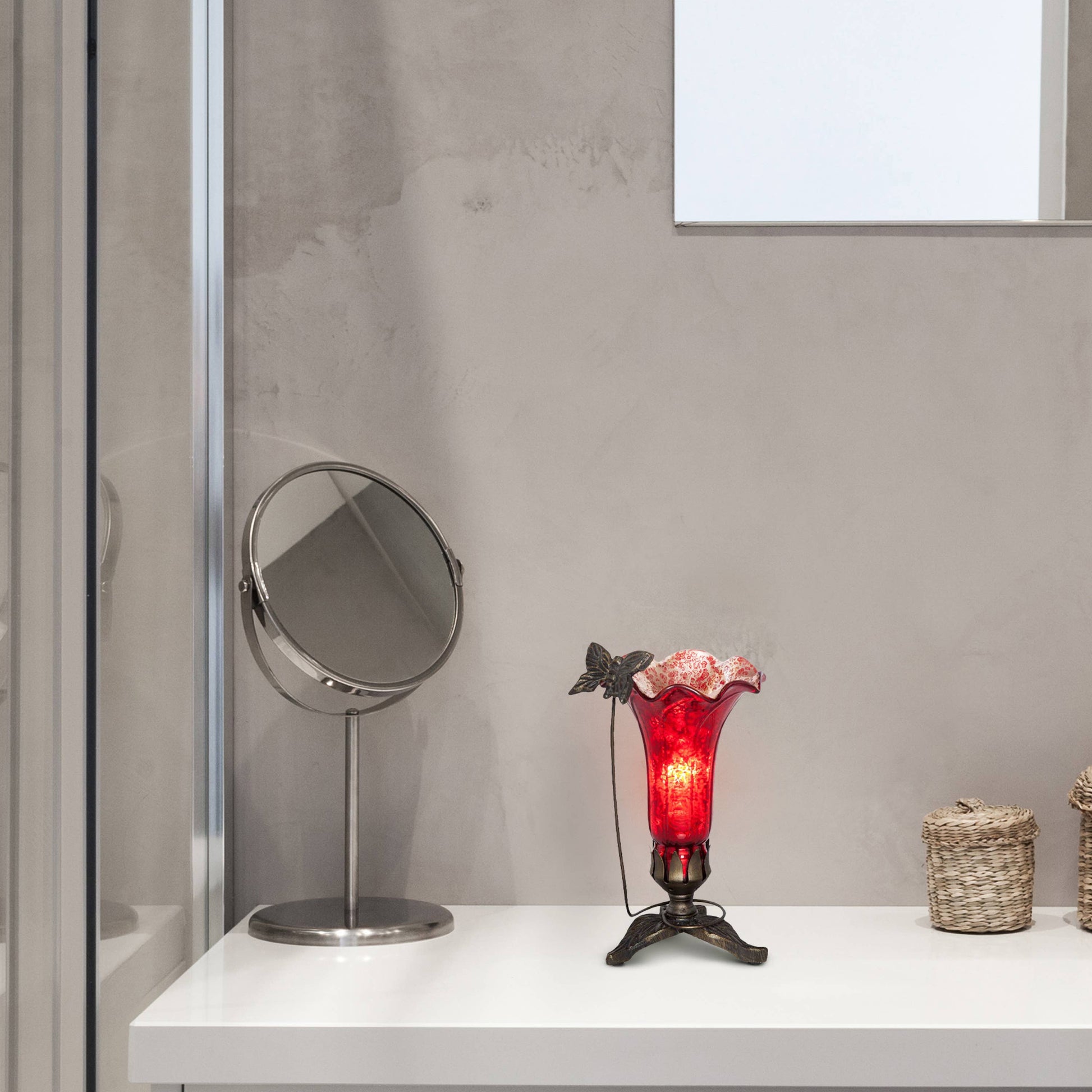 Fluttering with cuteness! This lily lamp is handcrafted with vibrant red mercury glass. The base is made with 100% hand cast metal and adorned with a flying butterfly hovering above the lily shade. The exquisite craftsmanship makes this an ideal accent for any space and lily lamps also make great gift items!