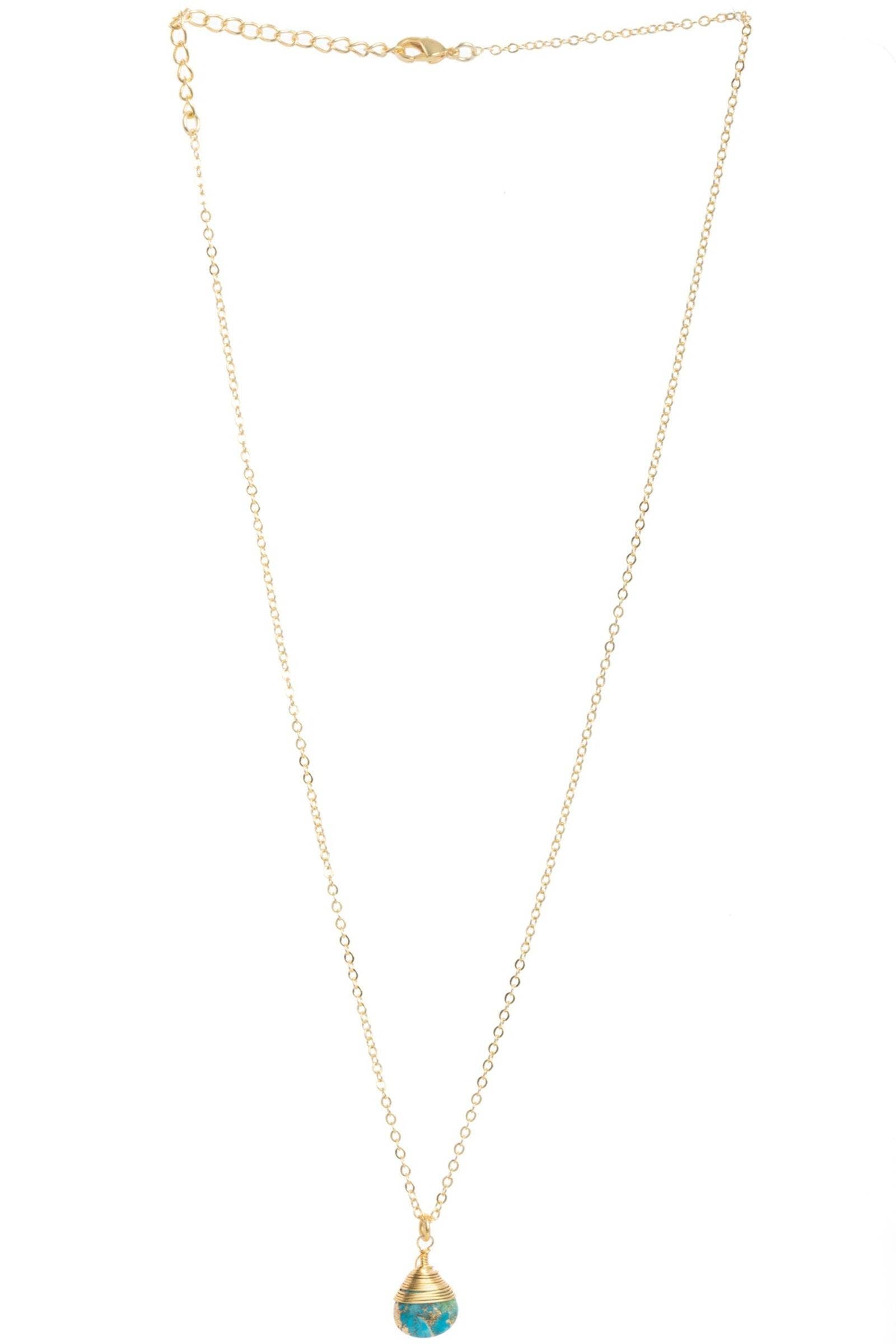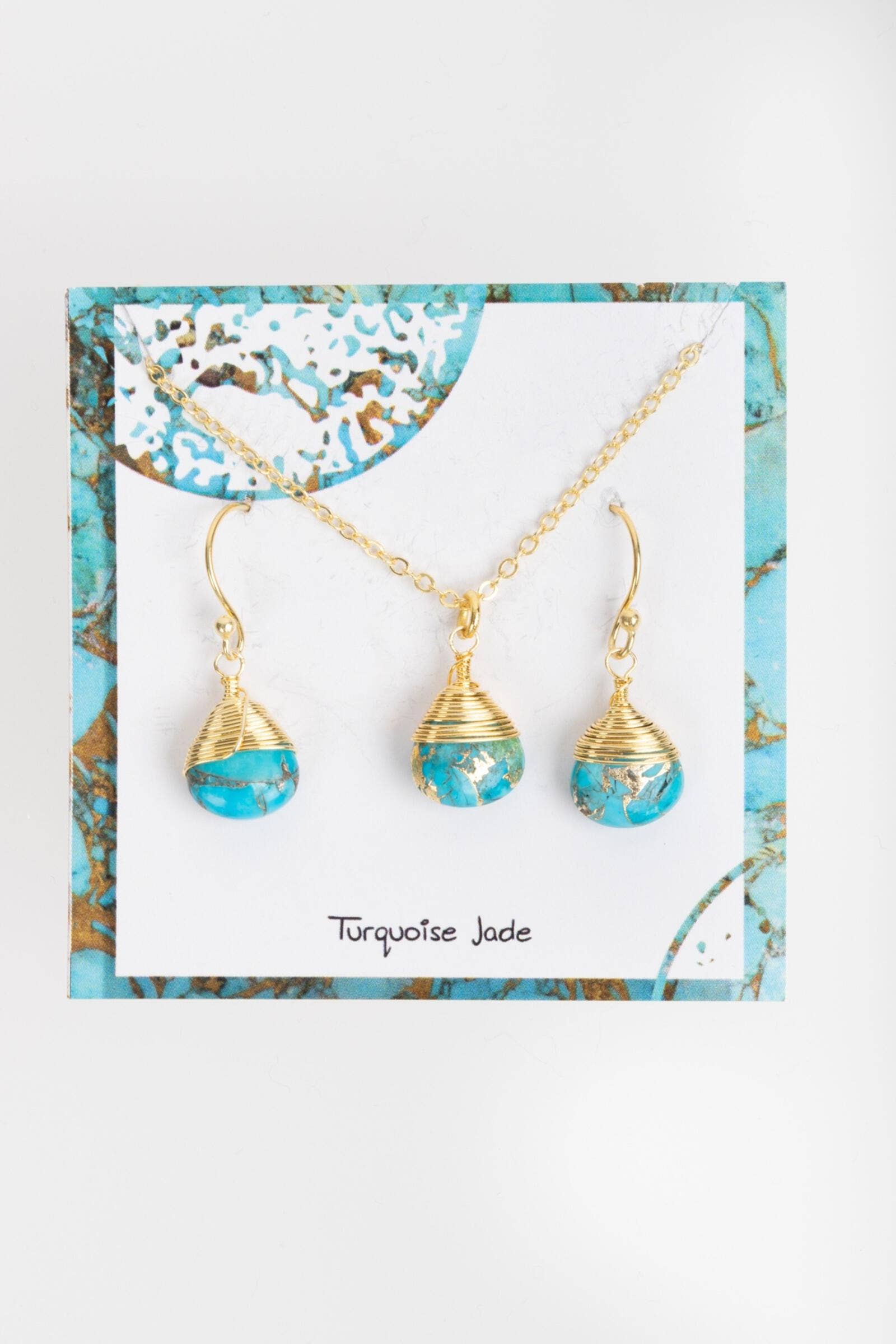 Introducing our exquisite Mojave Mini Raindrop Set, a perfect choice for anyone who appreciates the beauty and elegance of natural stones. This stunning set features a pair of earrings and a matching necklace designed to resemble a delicate raindrop shape. Each stone, crafted from high-quality Mojave turquoise, is uniquely colored with a stunning blend of blue and gold that resembles the peaceful oasis of the Mojave Desert. The earrings and necklace are adorned with an 18k gold-plated brass wire, adding a touch of luxury and sophistication to this already striking set. Each piece is expertly handcrafted with care and precision in India, ensuring that every detail is perfect, lightweight, and comfortable, making them ideal for any occasion. This gemstone set is a thoughtful birthday gift, a special anniversary present, or just a beautiful piece of jewelry to add to your collection.