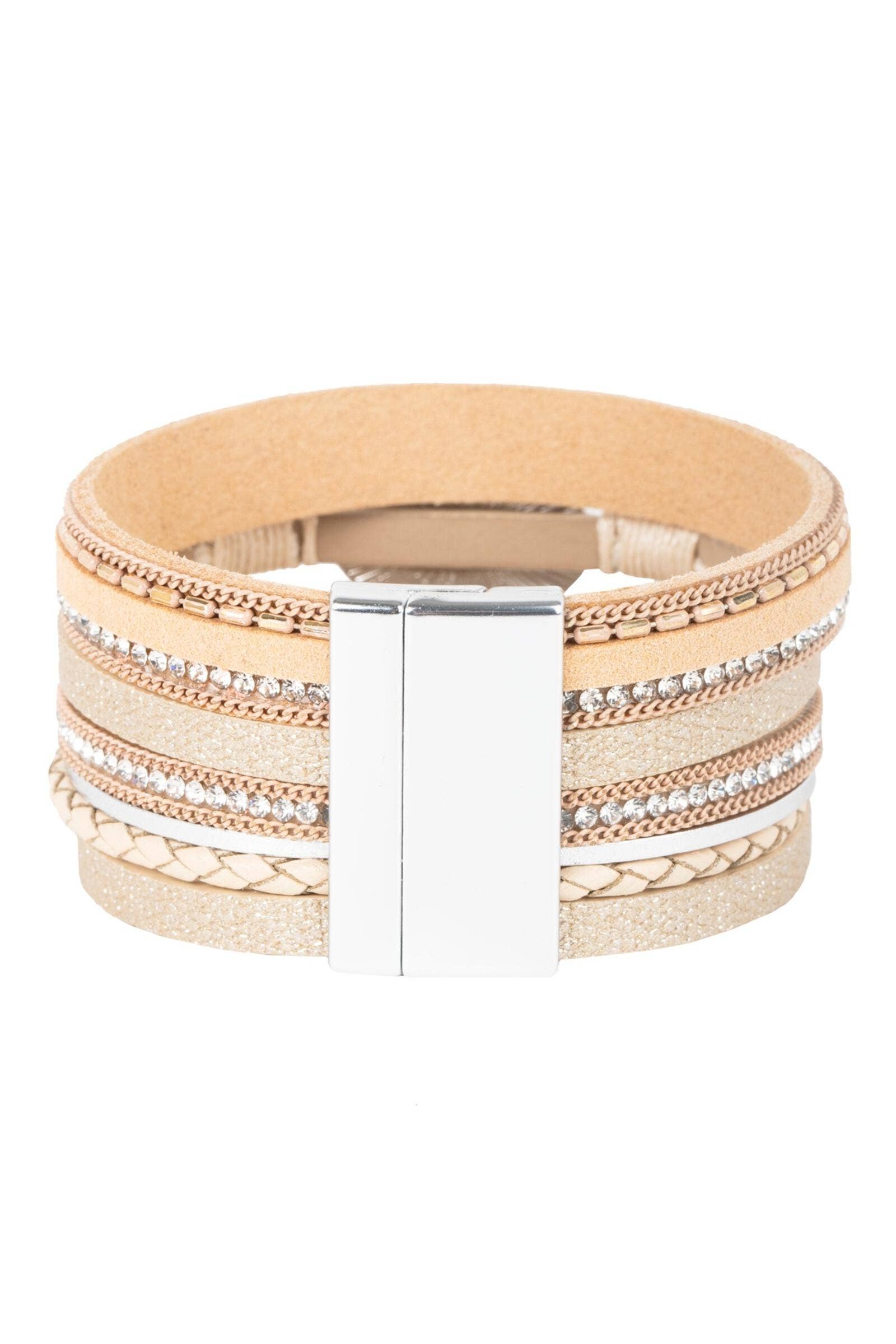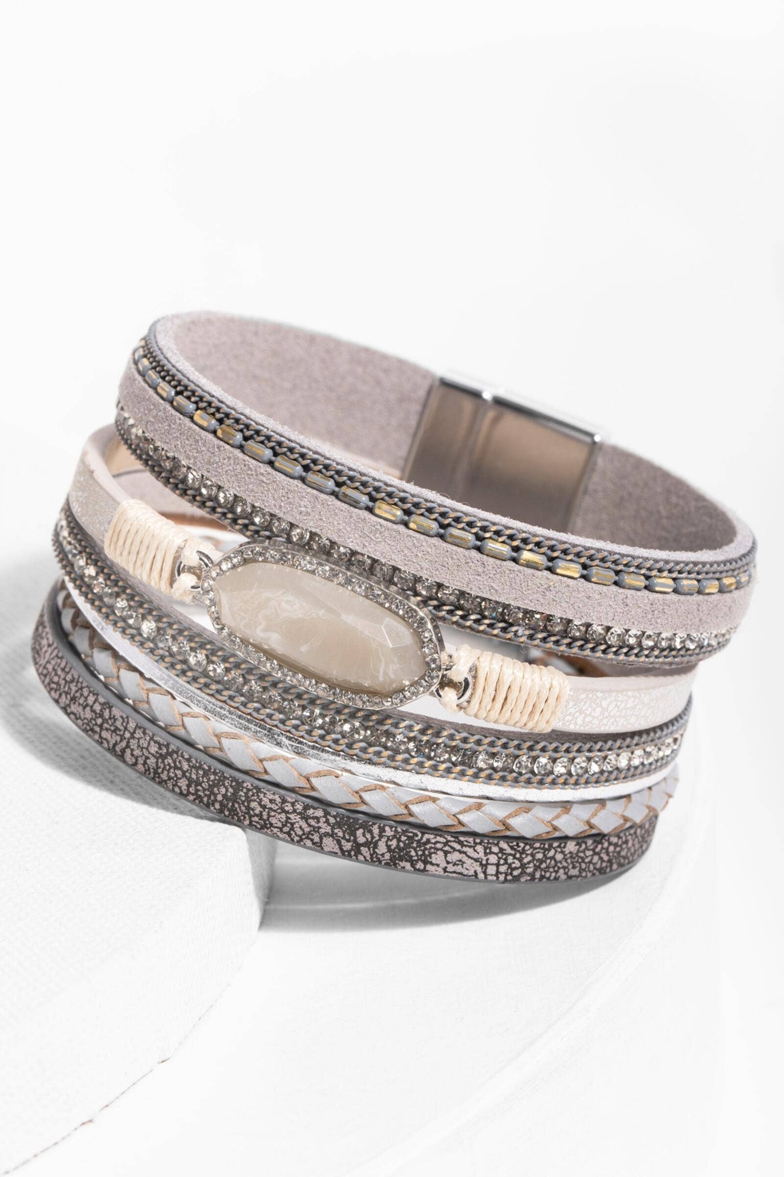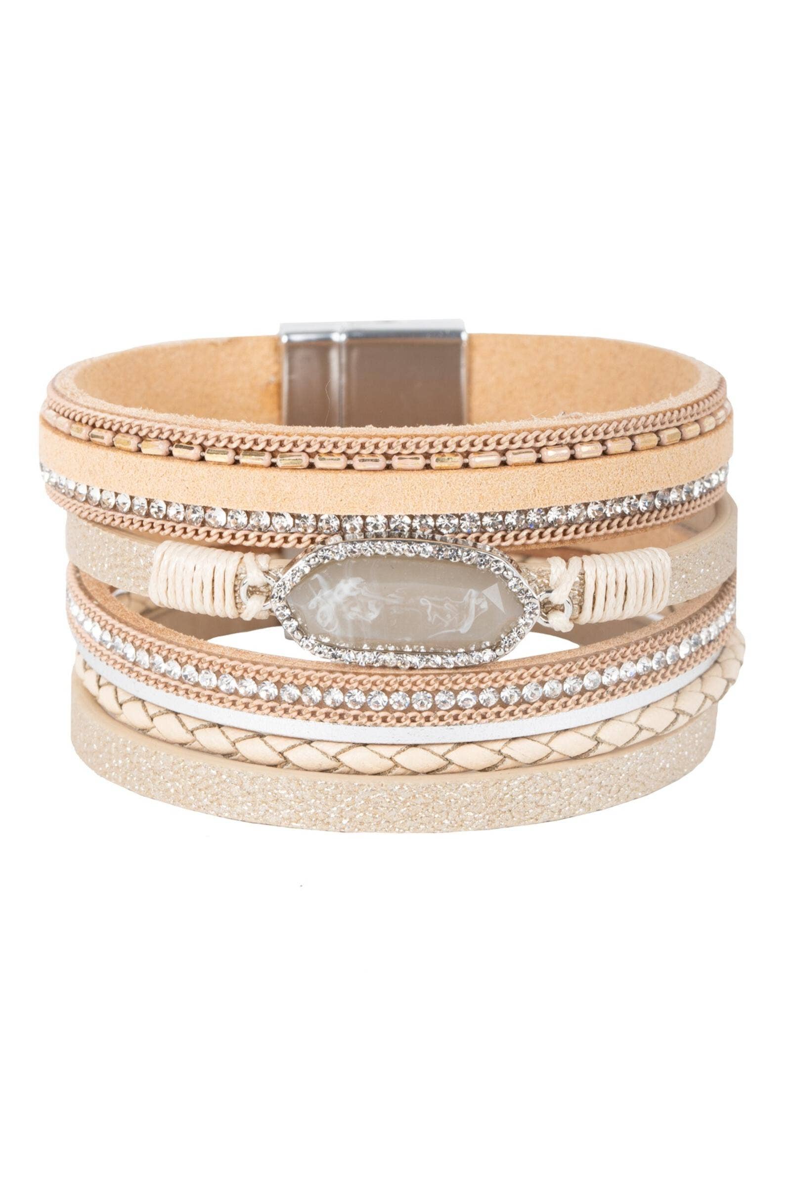"Dare to dazzle with this bejeweled Reno Leather Bracelet! Our multi-strand leather bracelet embellished with dazzling rhinestones beaded details grace this elegant center resin stone to create an eye-catching look. Its easy-to-use magnetic clasp will keep your day effortless and beautiful.