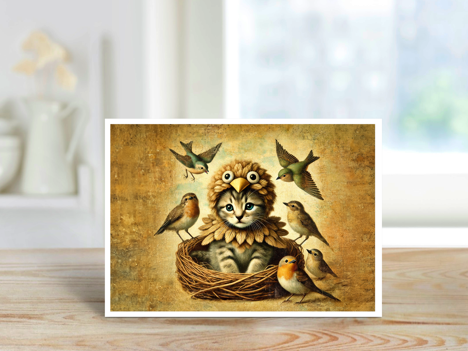 Nestled in among its feathered friends, this curious kitten tries its best to blend in, sporting an adorable bird costume that almost fools the flock!