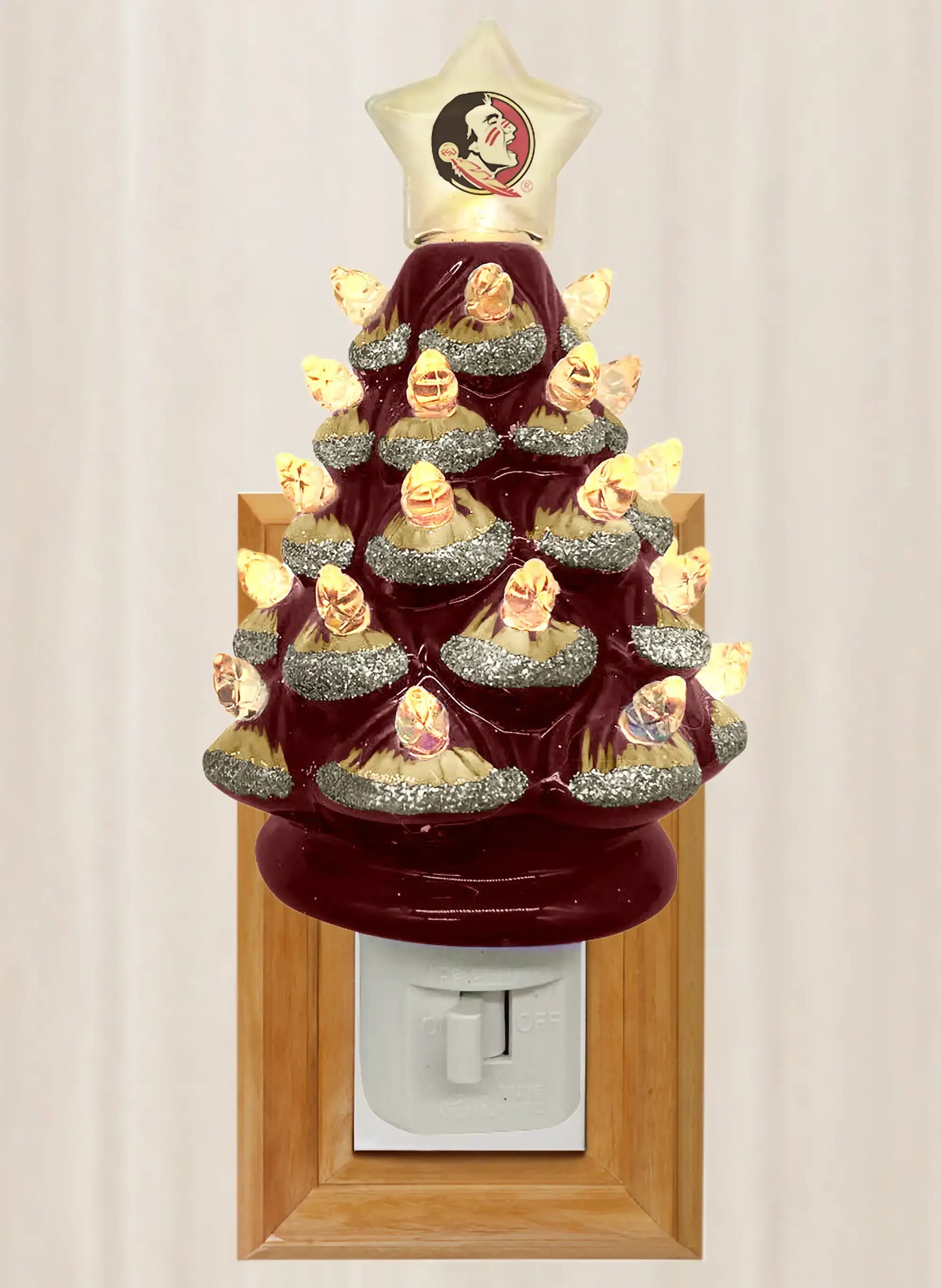 Made of long lasting, hand painted ceramic and powered by UL Approved parts, this festive school-themed Christmas night light will brighten the homes, and spirits, of all college sports fans. The clever two prong plug swivels in its base to vertically align the night light regardless of outlet orientation. Celebrate the holiday season in style with this unique school-colored 6.5” FSU Xmas Tree Nite Lite.