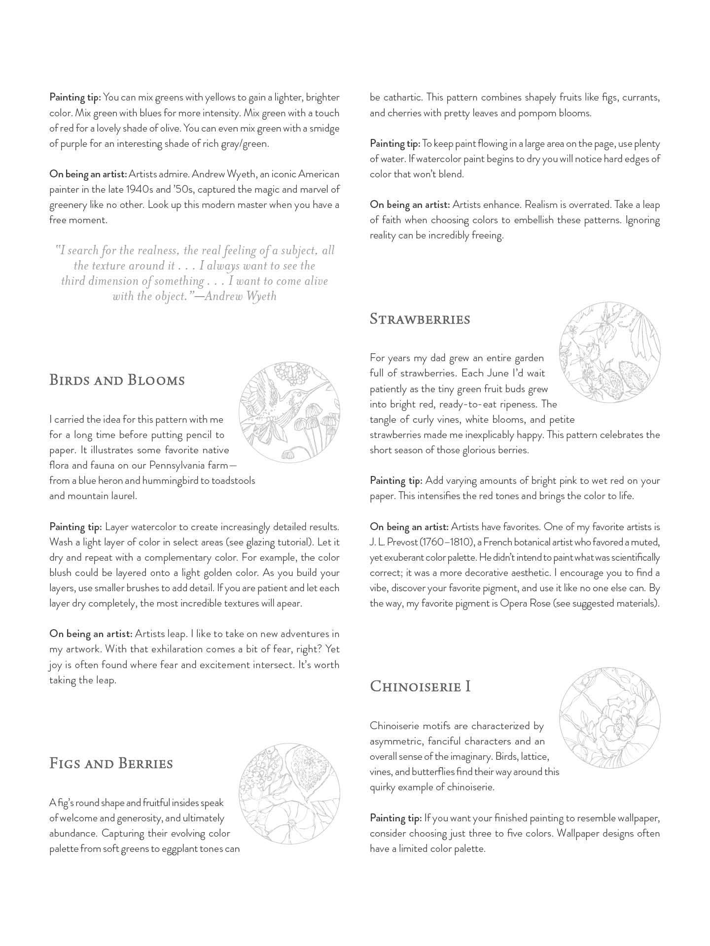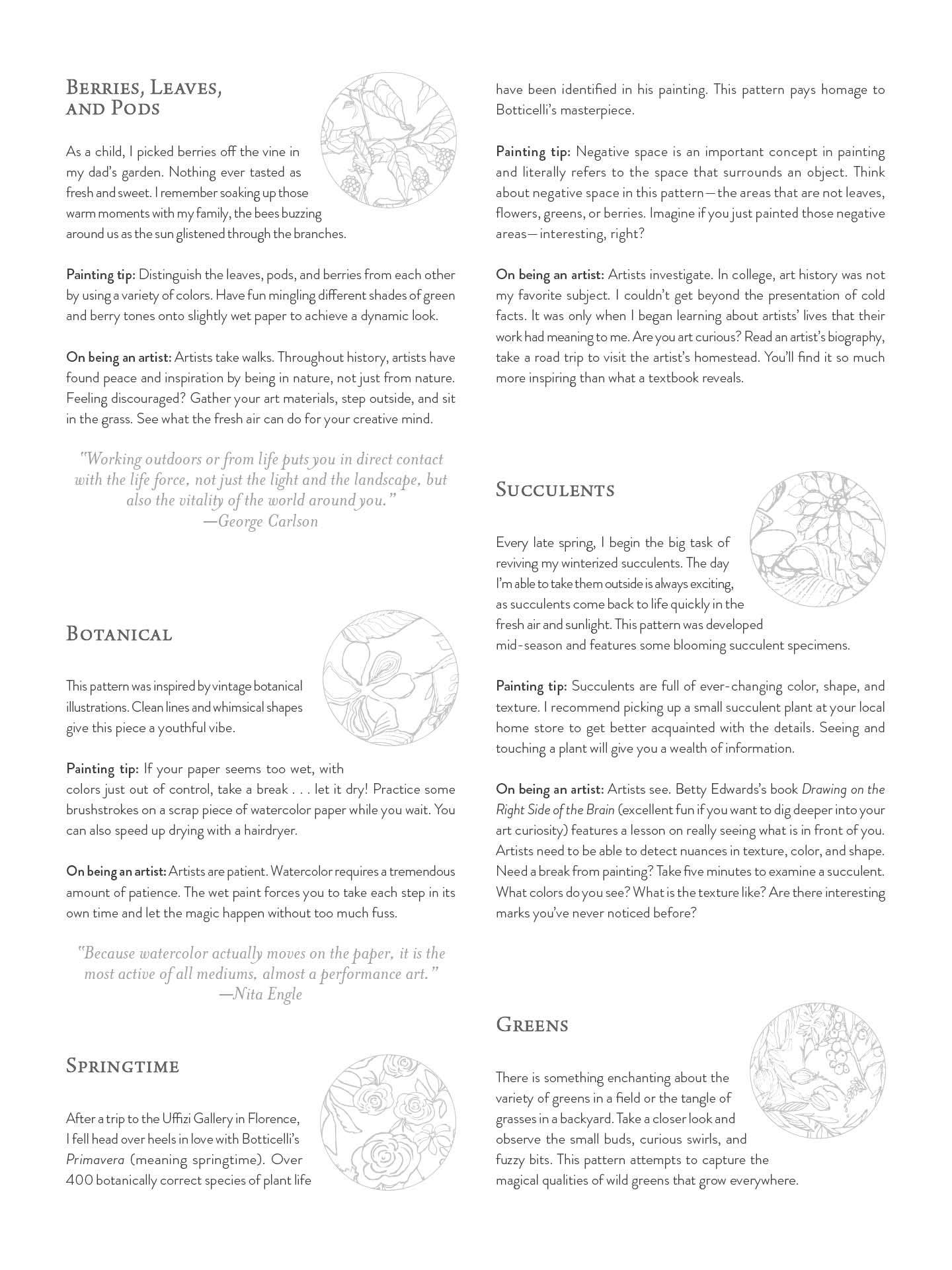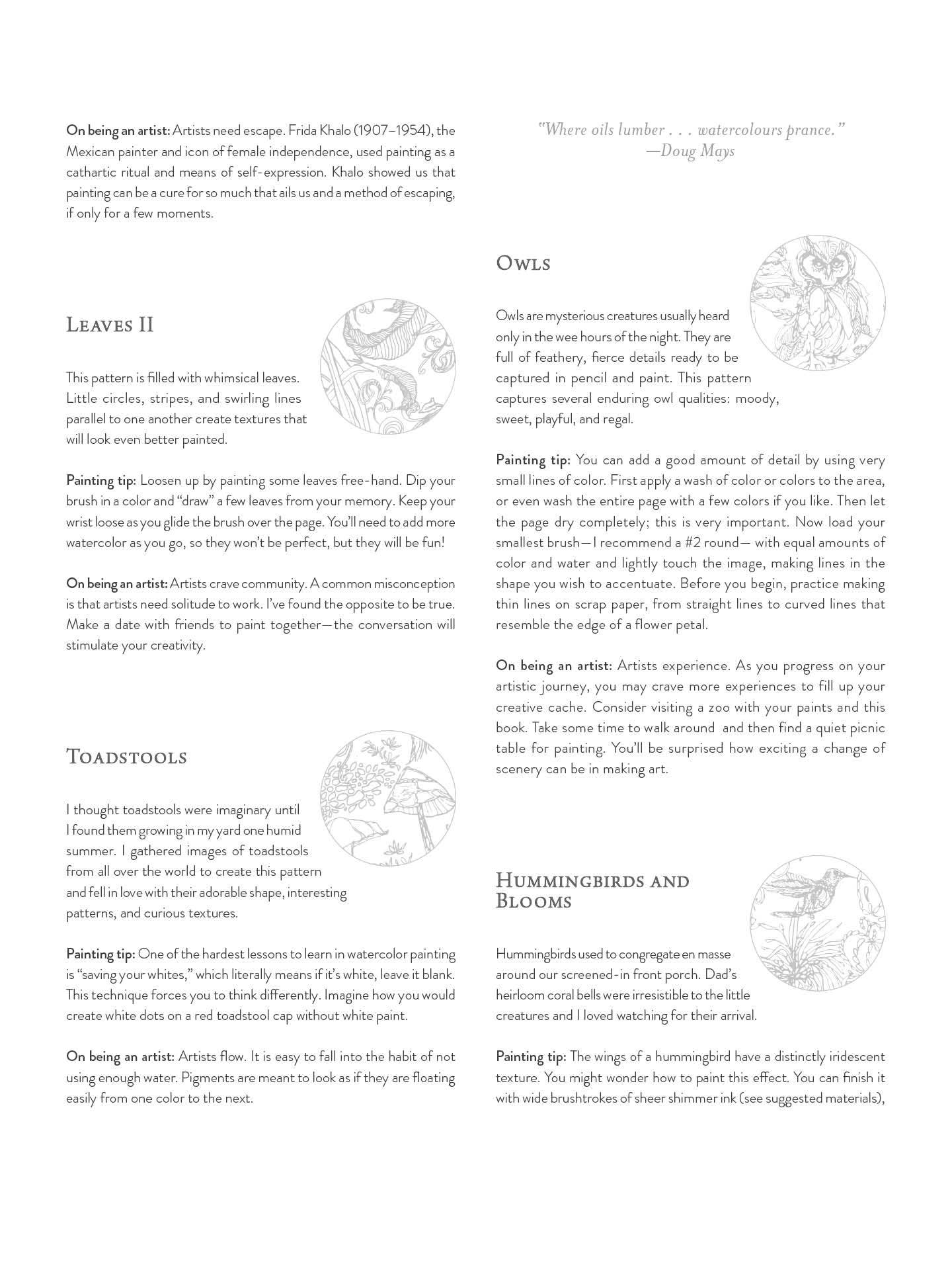 A book of 25 woodland sketches printed on lovely watercolor paper invites artistic experimentation with only a brush and paint. Each page is double-sided, offering the opportunity to paint the same page in different ways. The author shares painting tips for each sketch and advice for discovering the artist within.