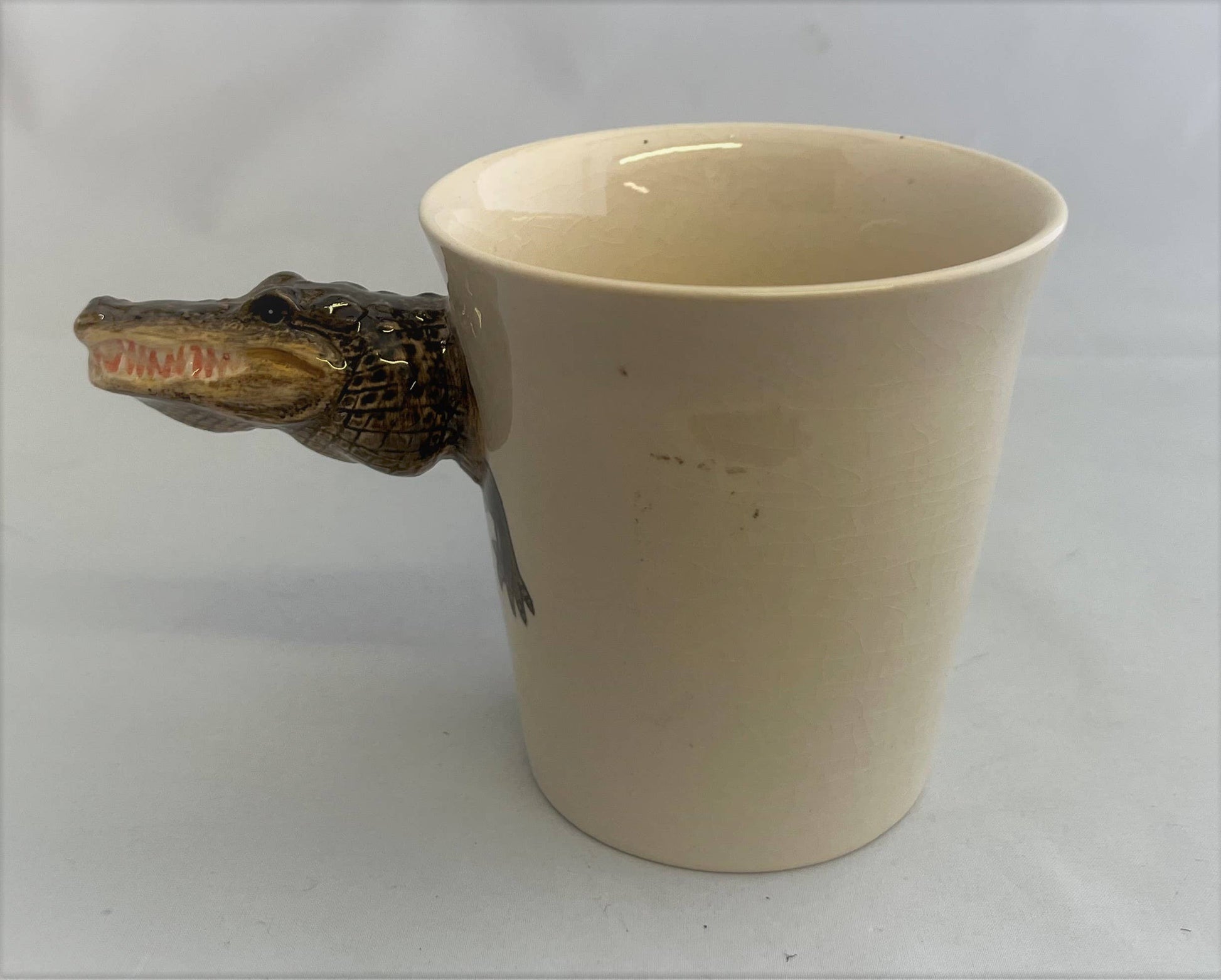 He may be about the most realistic mug we have ever created. SOOO ugly but a great seller in areas especially where alligators terrorize golfers! Our hand molded and hand painted mugs are ours exclusively, designed by our staff and produced by master ceramicists in Thailand. Mug holds about 8 ounces of joe, but these mugs are also handy for showing off pens and pencils or make up tools. And what fun they are for holding flatware for a casual supper party. Prop 65 compliant. Colors vary slightly from batch to batch.