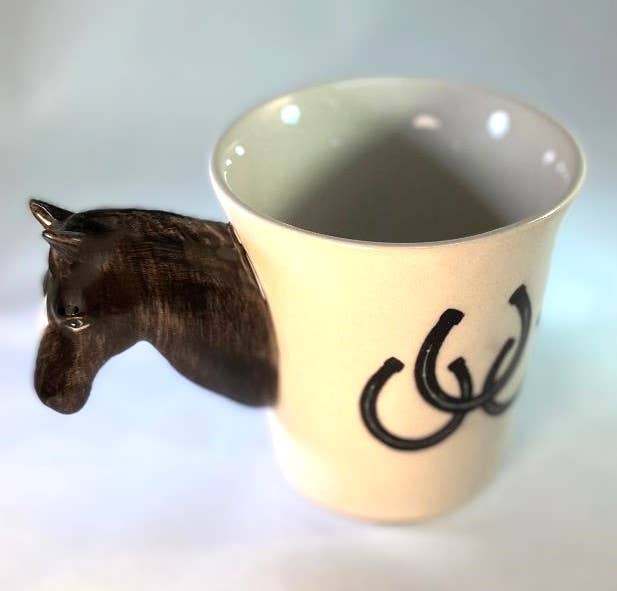 We love these handsome horse mugs for morning coffee or tea and to corral pens, make up brushes or toothbrushes. Horse lovers will be so happy to find these in your store. Easy to hold handle too. Fine hand painting of elegant horse head and some horseshoes for good luck. Microwave and dishwasher safe. Prop 65 compliant. Mug holds about 8 ounces.
