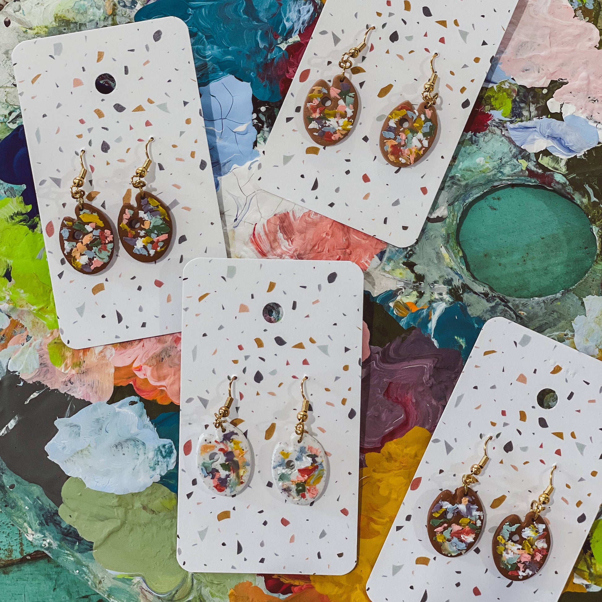 Artist paint palette earrings, made to resemble used wooden paint palettes only they're made entirely of clay! Each earring varies slightly due to the nature of it being handmade, making each pair unique + one of a kind!