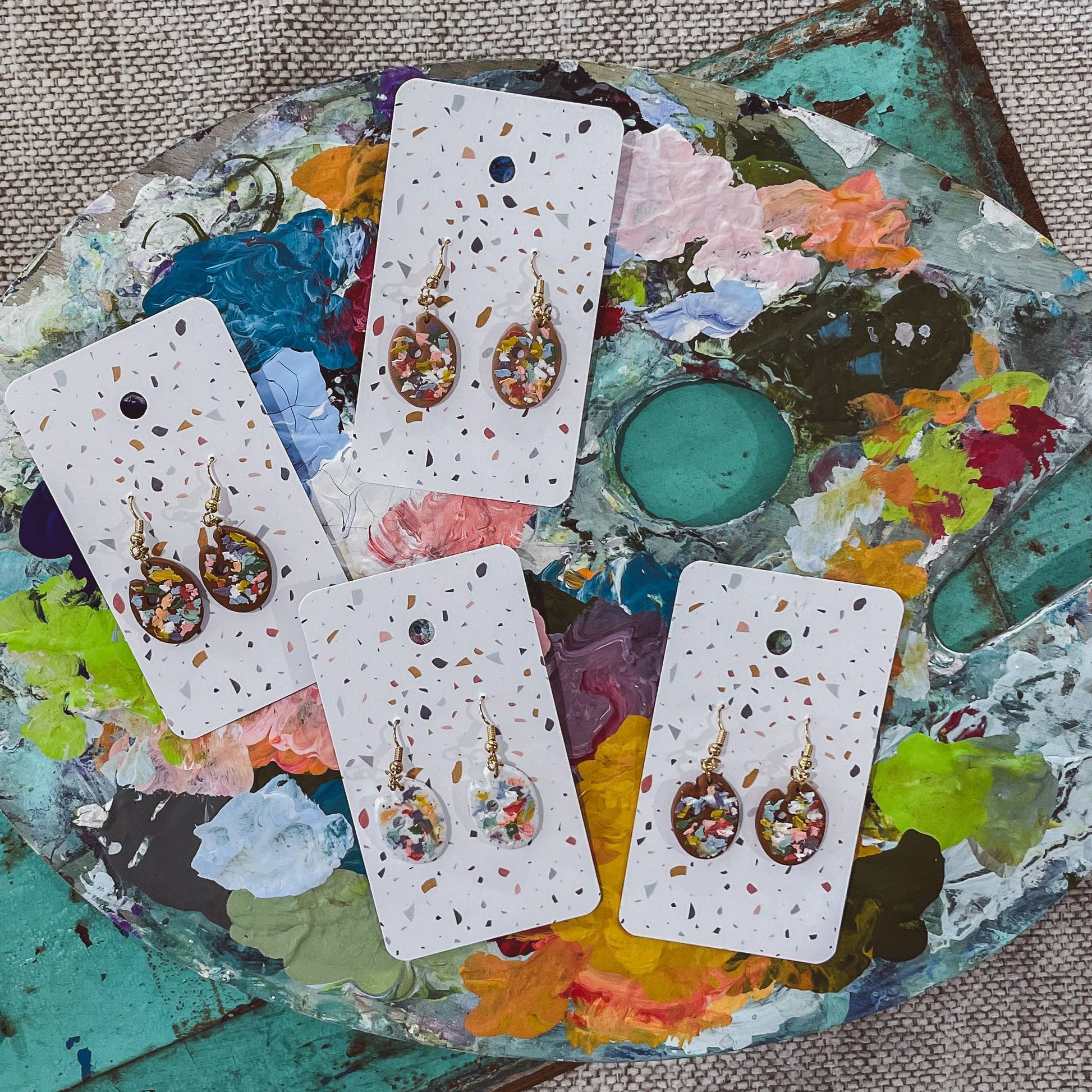 Artist paint palette earrings, made to resemble used wooden paint palettes only they're made entirely of clay! Each earring varies slightly due to the nature of it being handmade, making each pair unique + one of a kind!