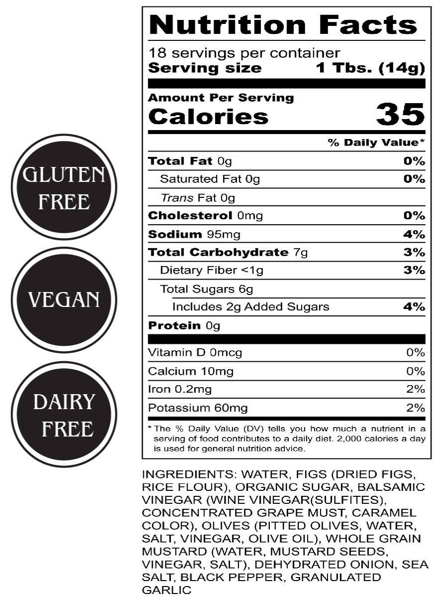 This big flavored relish combines the sweet taste of figs with the salty essence of Kalamata olives in one mouthful. It is the perfect compliment to soft goat cheese or brie, and a crusty baguette. 9 oz size. Appetizer recipe cards included with each order!
