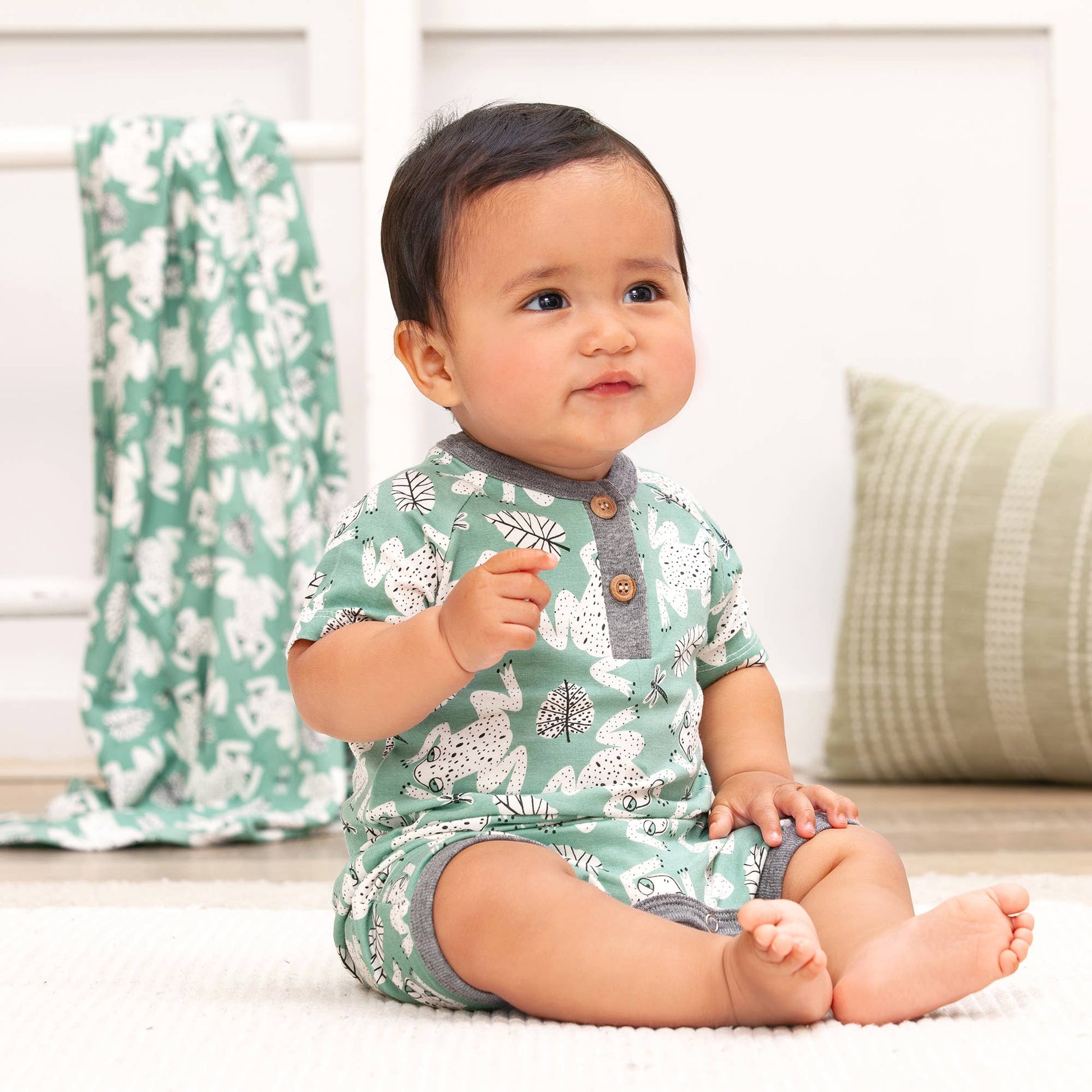 Made from a super soft blend of bamboo, cotton, and spandex, this adorable Henely shortie romper features a playful leapfrog design on a soothing sage green backdrop. Little ones will be both stylish and comfortable in this absorbent, hypoallergenic, and eco-friendly outfit. With buttons in front and snaps underneath, dressing is a breeze. Just wash it in warm water and tumble dry on low for easy care.