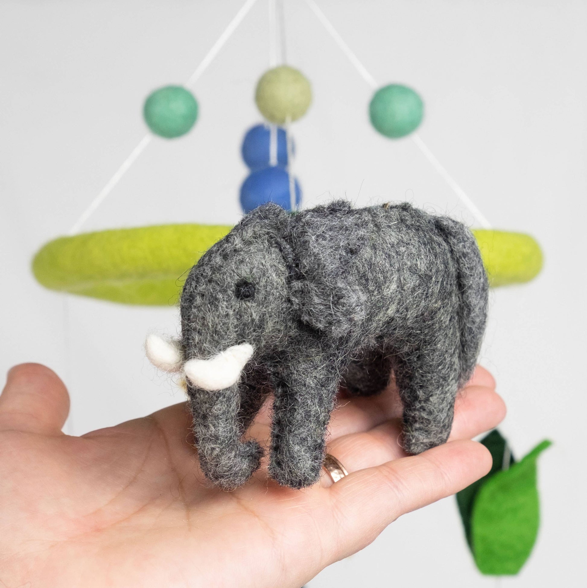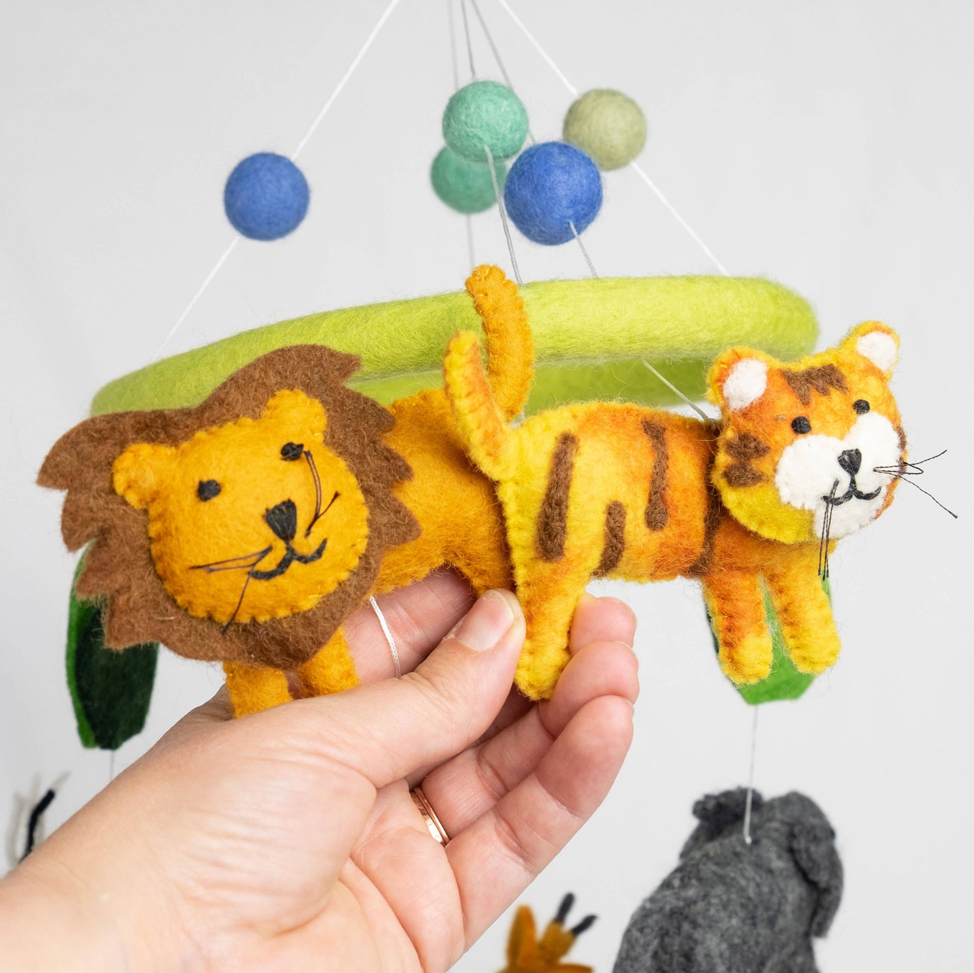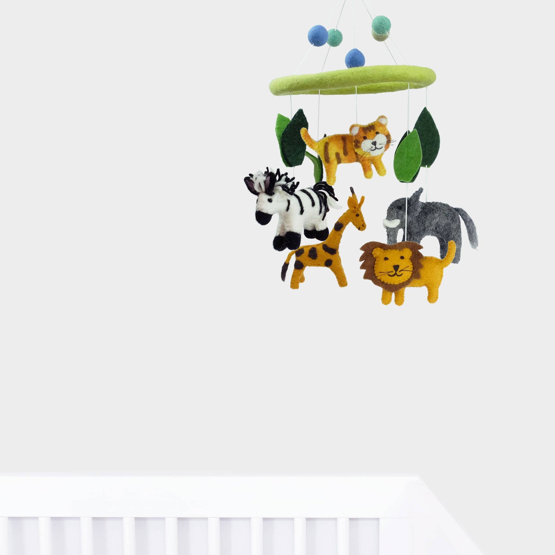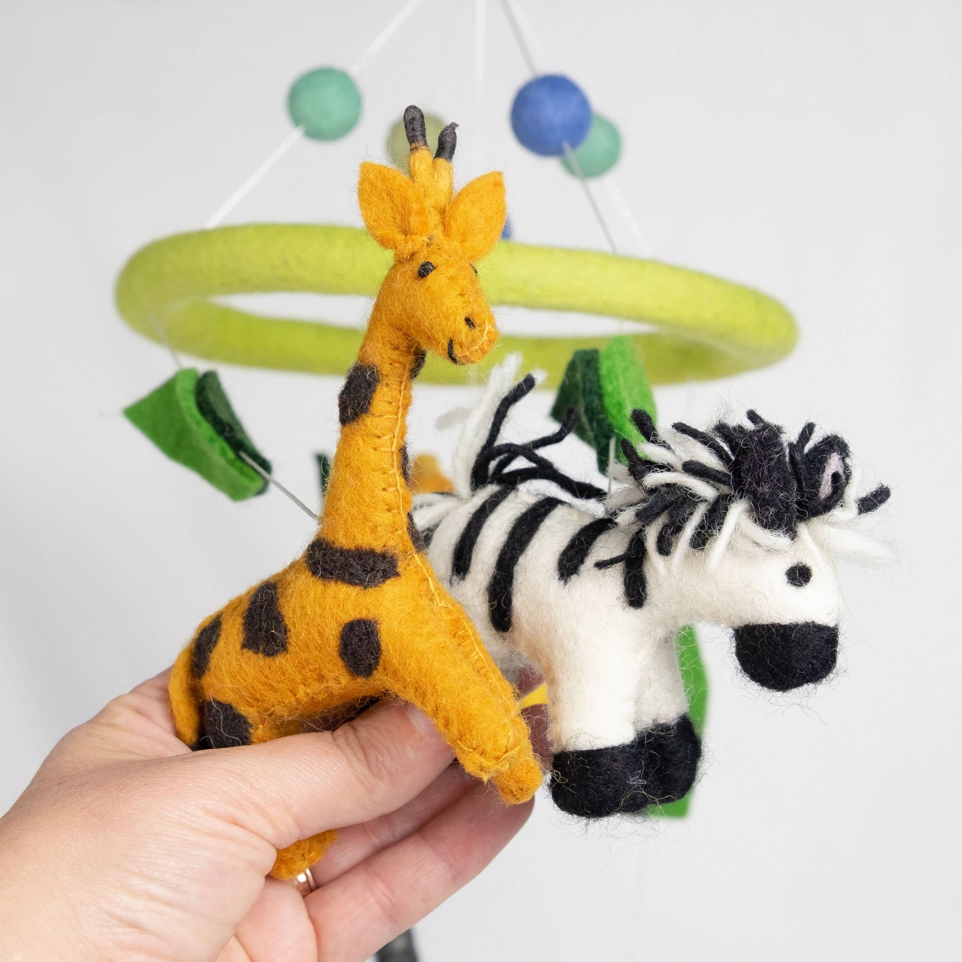 Our cute and colorful Jungle Animal mobiles are approximately 20" high x 7.5" across. Our felt mobiles our hand made in a small family run, fair trade workshop in Kathmandu Nepal. Made from 100% natural wool, no chemicals are used during production. We give a portion of our proceeds to pay full school tuition for three of our workers children.