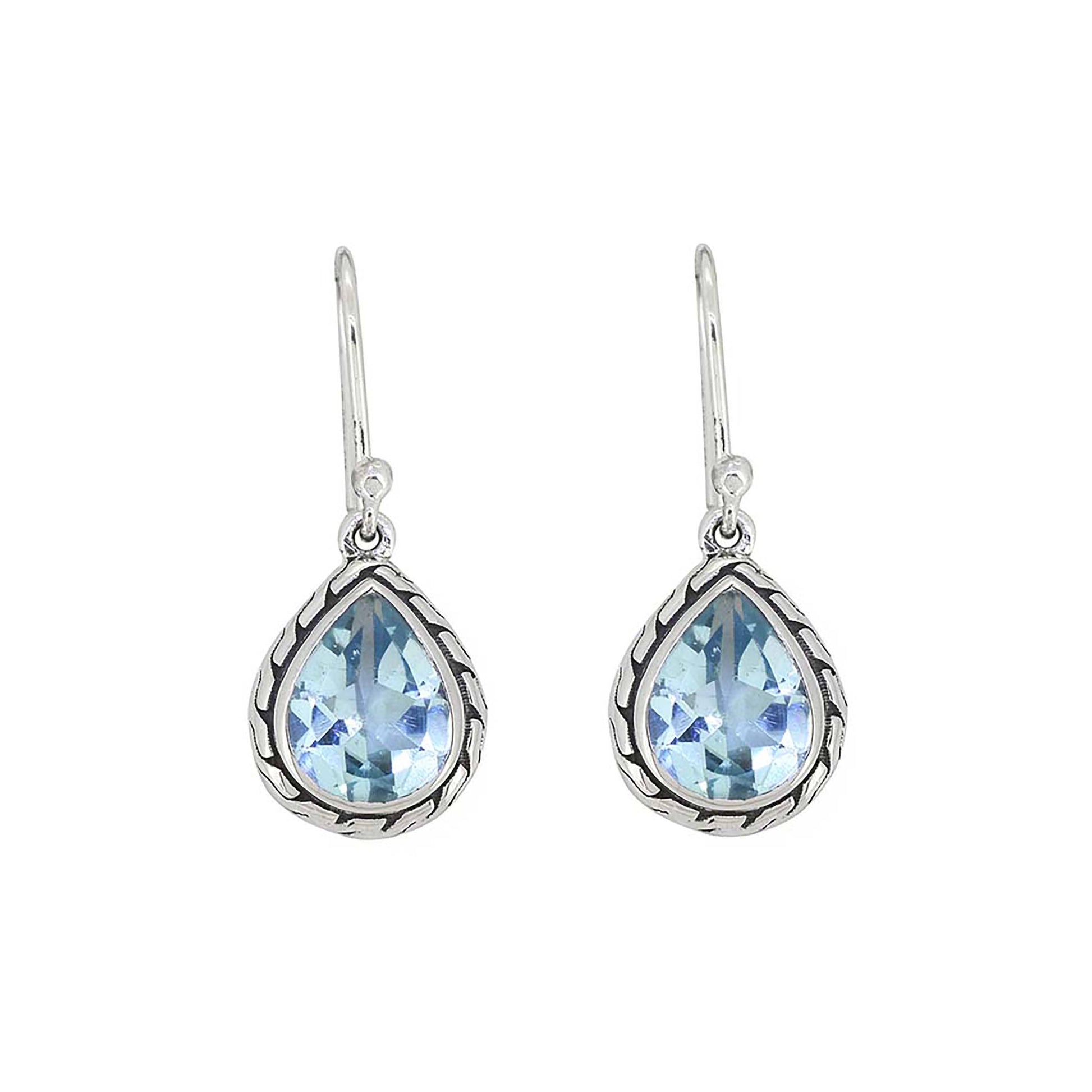 Each earring features a teardrop-shaped light blue colored blue topaz gemstone, set within a sterling silver metal frame with a patterned border. The pattern on the border appears to be a woven or braided design. The metal findings are a light silver tone. The earrings have a standard hook-style closure, attached to a small ball-shaped end on the back of each earring. The overall style is somewhat bohemian or artisan-inspired.