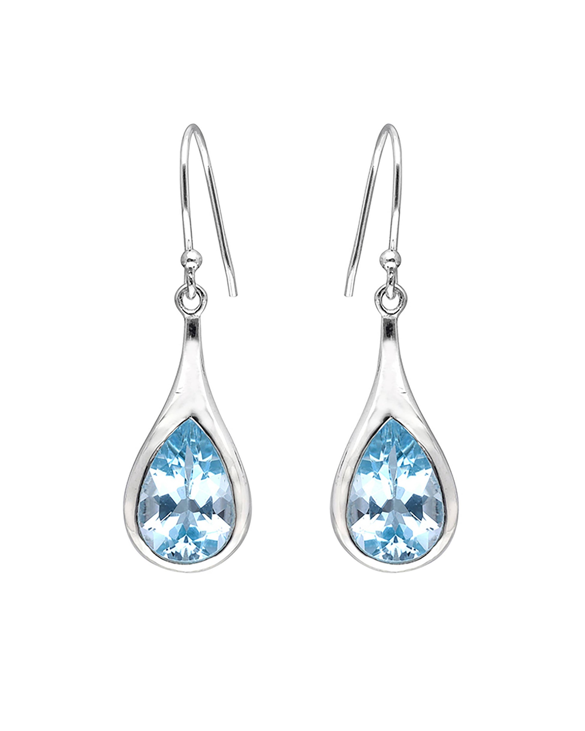 Each earring features a teardrop-shaped, light sky blue topaz gemstone set within a slightly curved, silver-tone sterling silver metal frame. The earring settings have a concave shape that frames the gemstone. The metal is a light, polished silver tone. The earring backs are a simple, hooked style, typical of dangle earrings. The earrings have a hook design for easy wearing. The blue gemstones are faceted, giving them a sparkling appearance. The combination of the blue stones and the silver setting creates a sophisticated and stylish look.