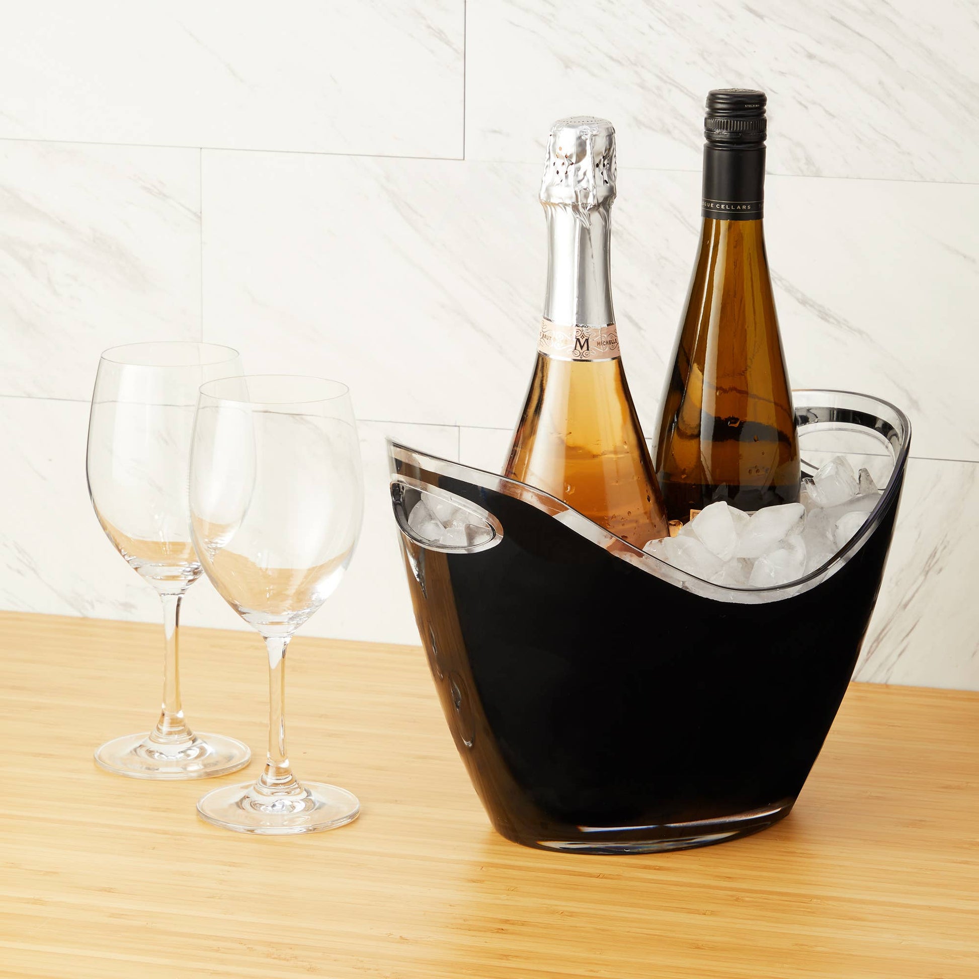 Roomy, featherlight and stylized, this modern ice bucket comes party-ready. Cut-out handles allow for easy mobility, so you can take it to the beach, to the tailgate, or just the backyard. Low-cut sides make it easy to swoop in and grab another bottle.
