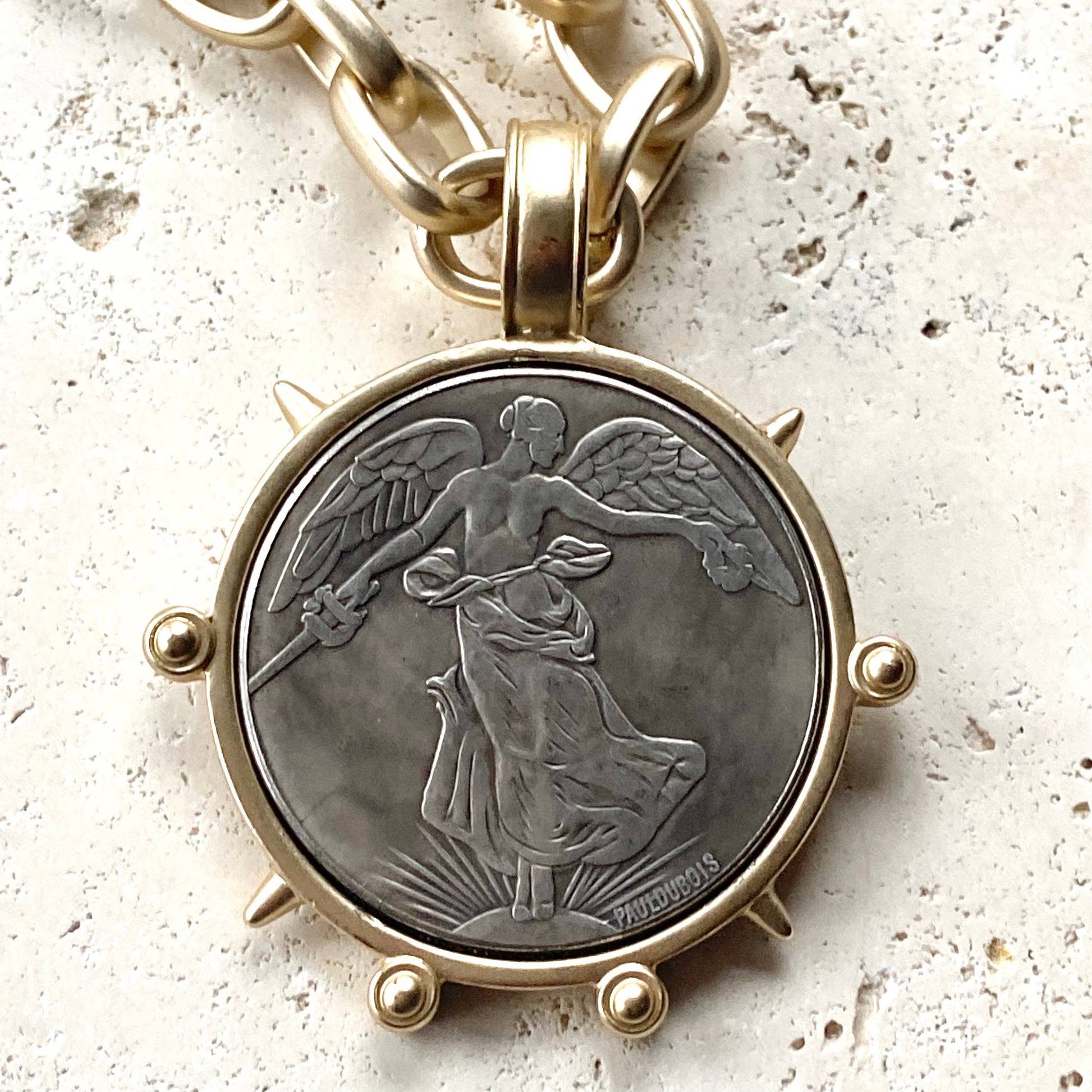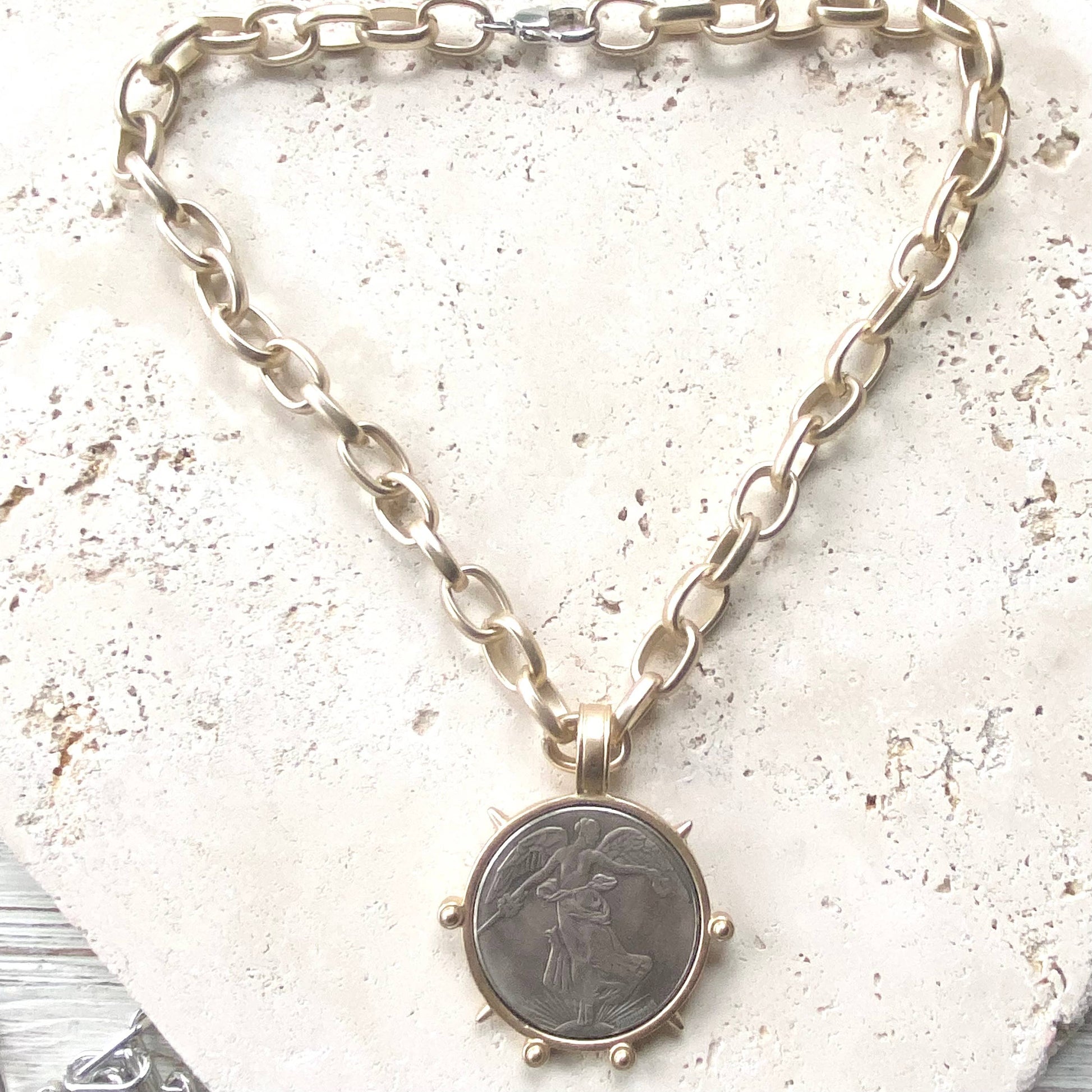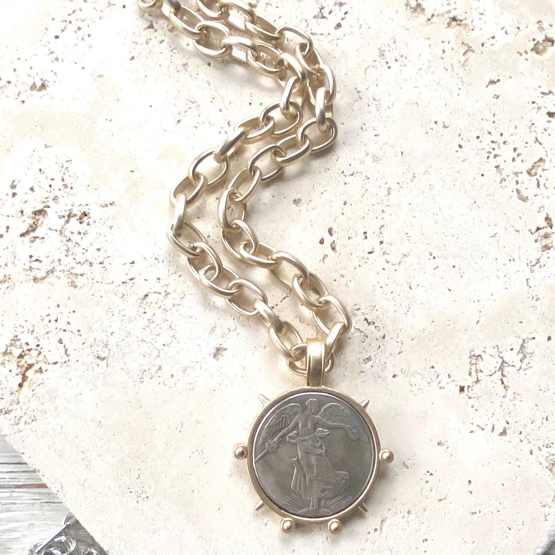 VB&CO Designs Handmade Jewelry - Medallion French Angel coin necklace boutique jewelry: Burnished silver
