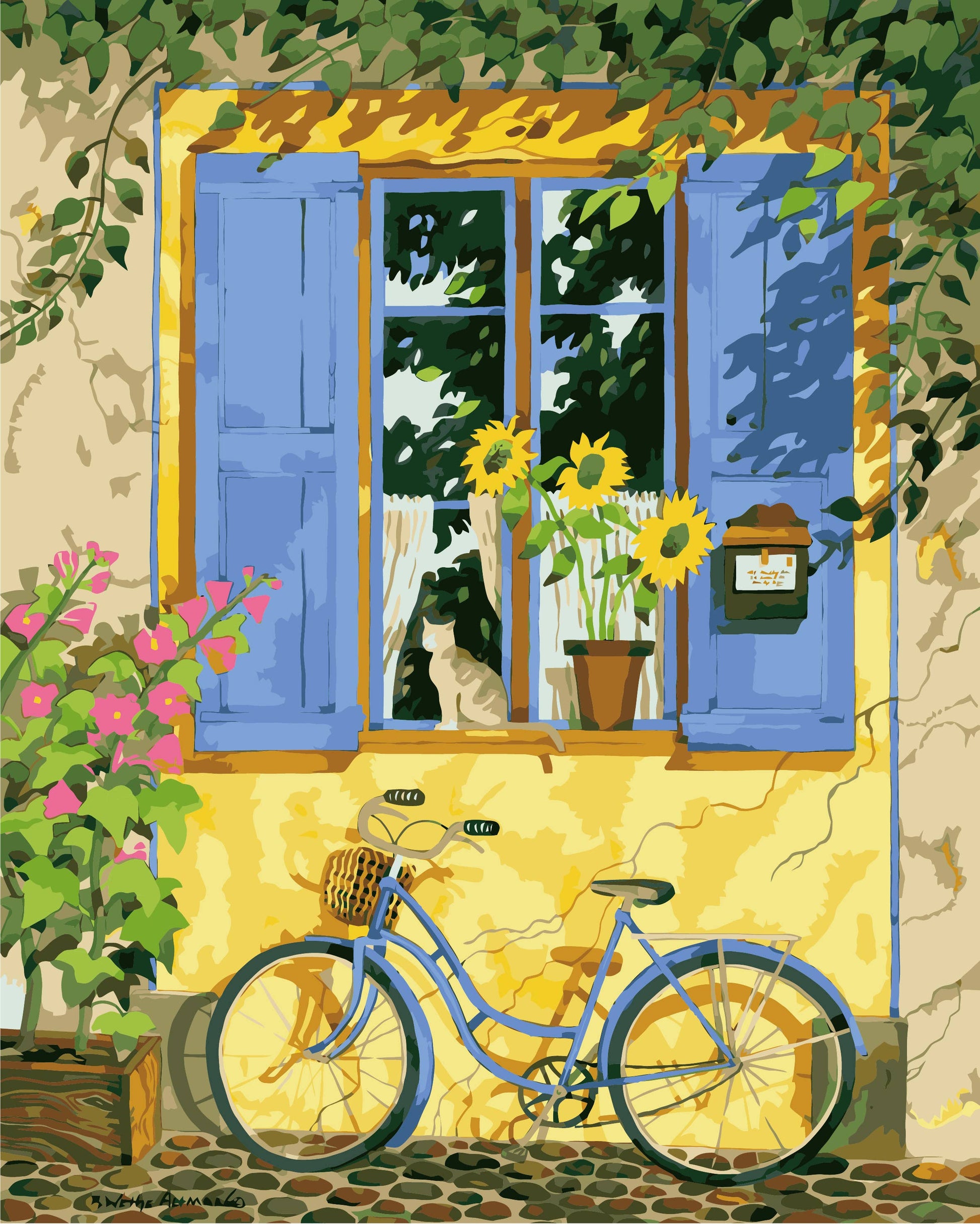 The painting "A Woman of Independent Means", made by Robin Wethe Altman, depicts the outside of a colorful house wall, where a window is open, and a bicycle is resting in the sunlight. The lively colors full of pigments inspire feelings of happiness and warmth, reminiscent of a quiet, sunny summer day.