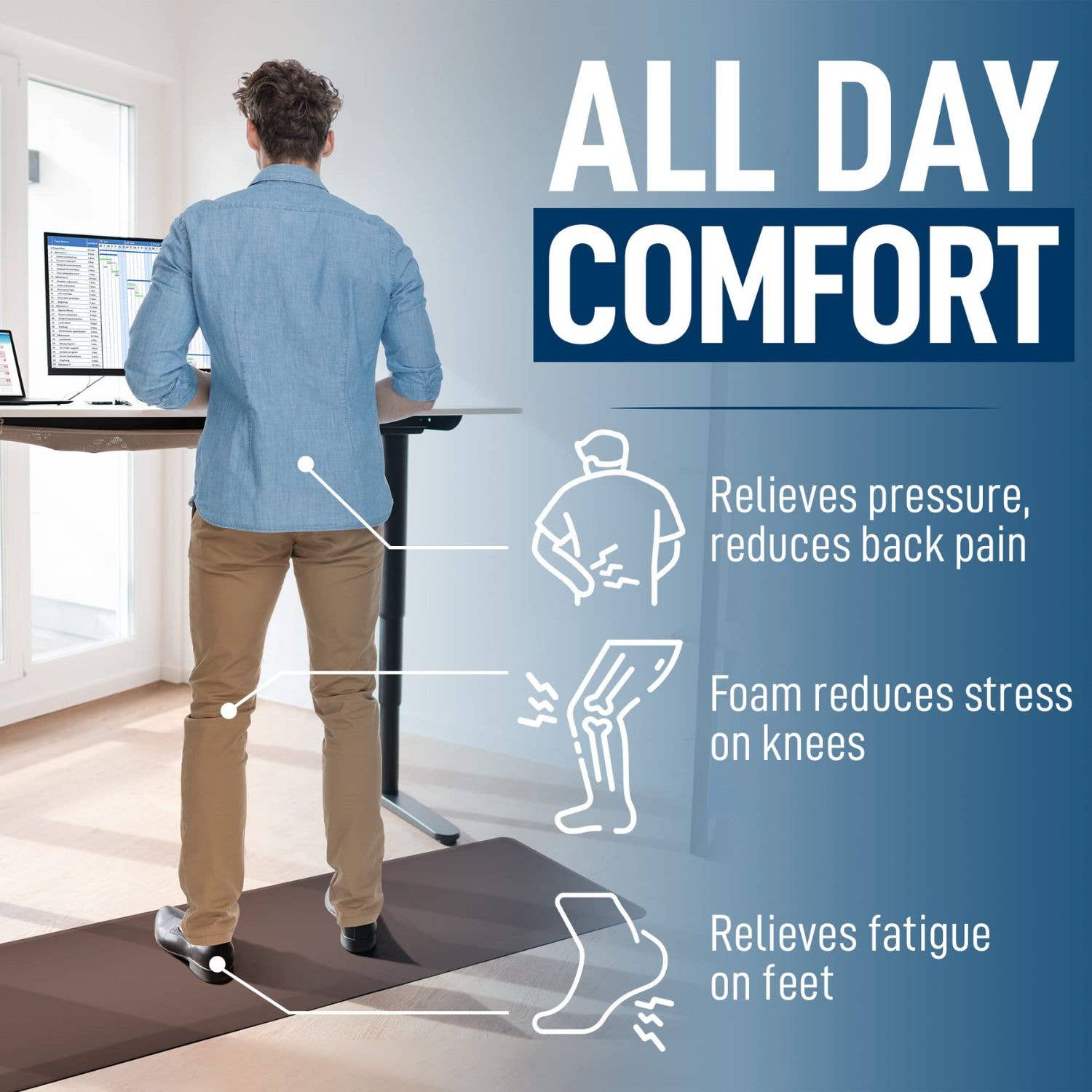 Relieve foot, knee, and back strain with this anti-fatigue mat featuring ¾-inch thick, high-density foam. Its ergonomic cushioning makes standing for long periods stress-free, ideal for use in kitchens, laundry rooms, or standing desks.