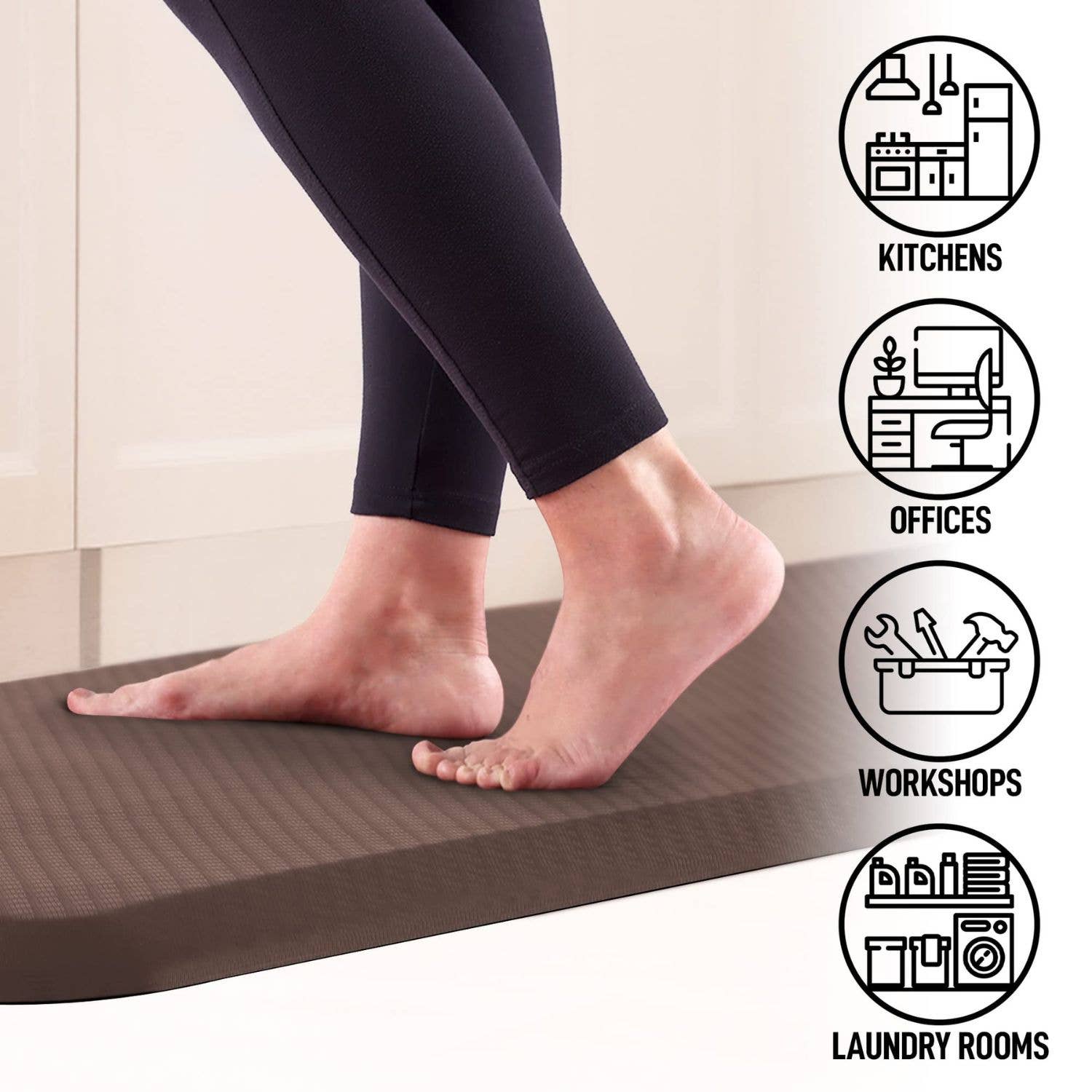 Designed with a durable anti-skid rubber base, this standing mat stays securely in place on a variety of surfaces. The beveled edges prevent tripping, while the mat’s seamless construction fits perfectly into corners and tight spaces.